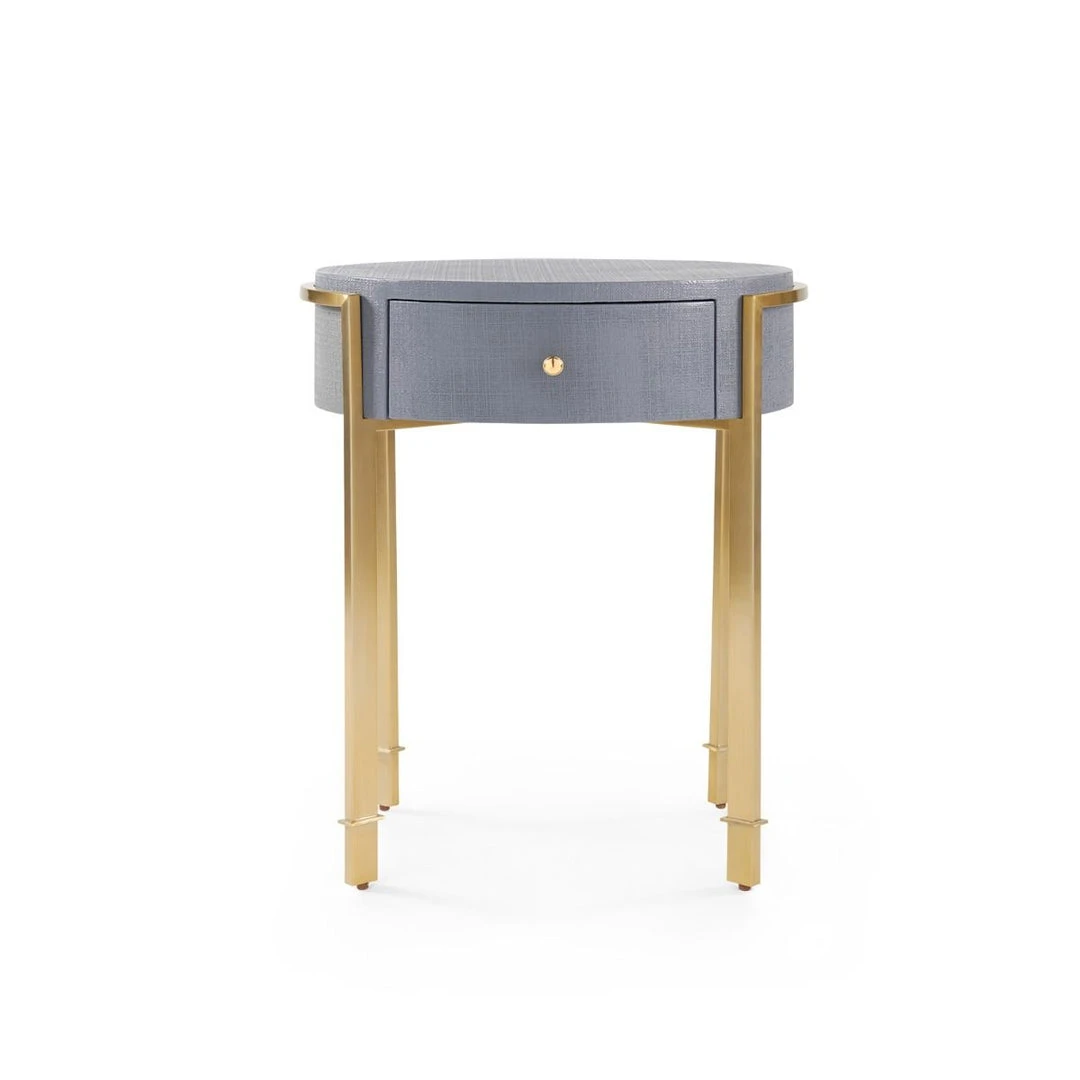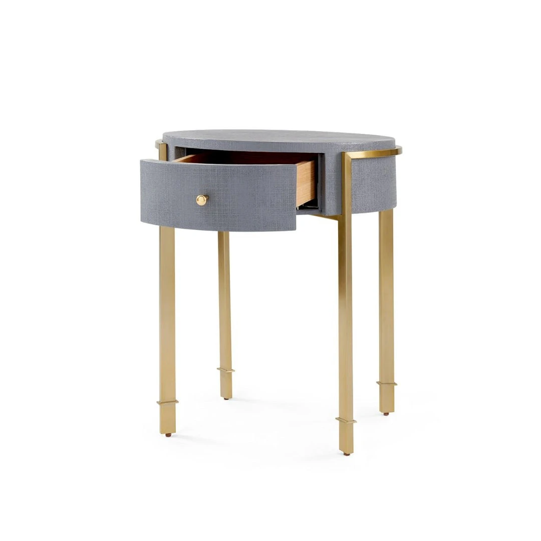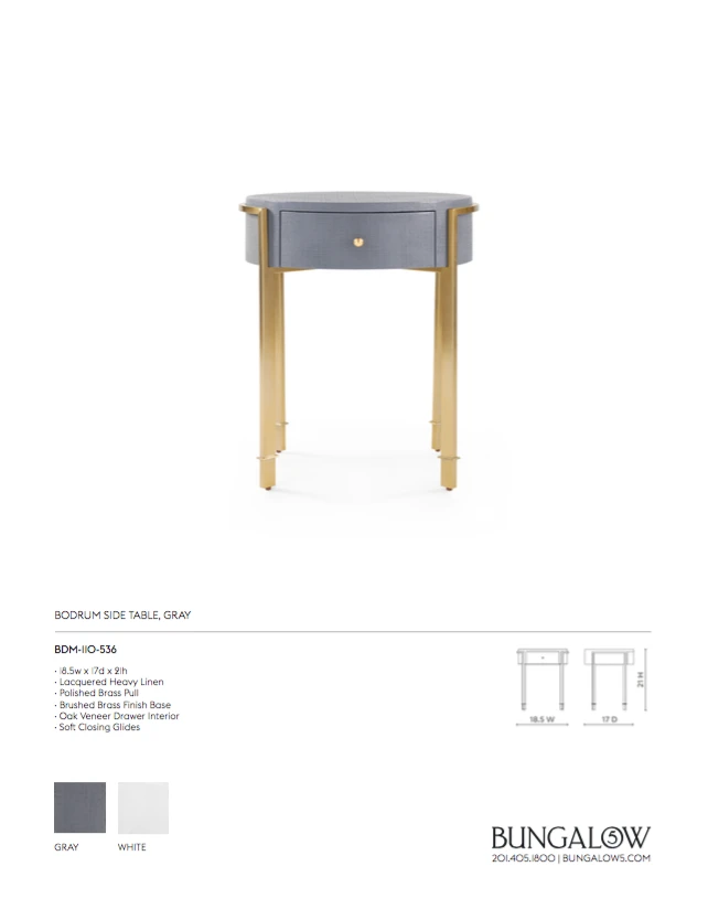 Lacquered heavy linen brings a modern elegance to the Bodrum Side table in Gray from Bungalow 5. With a hand-crafted brushed brass base and a polished brass pull, these side tables exhibit a touch of whimsy and approachability. The Bodrum side table is perfect for when you need a side table to place between two chairs or the perfect companion side table for a low sofa. The drawer is the perfect place to store a television remote, matches for a scented candle, or drink coasters. Standout craftsmanship details include soft closing glides and oak veneer drawer interiors.