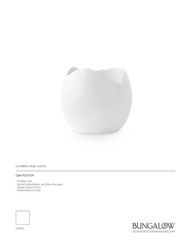 The Cambria Vase from Bungalow 5 references history and takes inspiration from organic shapes. When ostriches were discovered by 16th century Europe, they were considered rare and almost mythical animals. They were prized for their voluptuous feathers, which cost more than their weight in gold, and their giant eggs were turned into a variety of decorative curios. As a nod to this history, Bungalow 5 has scaled up the ostrich egg in fine hand-made Blanc de Chine porcelain. This oversized version is a functionally beautiful objet d’art. Glazed on the inside and matte on the exterior, it is a giant oval with the top removed to resemble a cracked egg. It has a cool minimalist appeal and is perfect for a centerpiece or an overscale coffee table accessory.