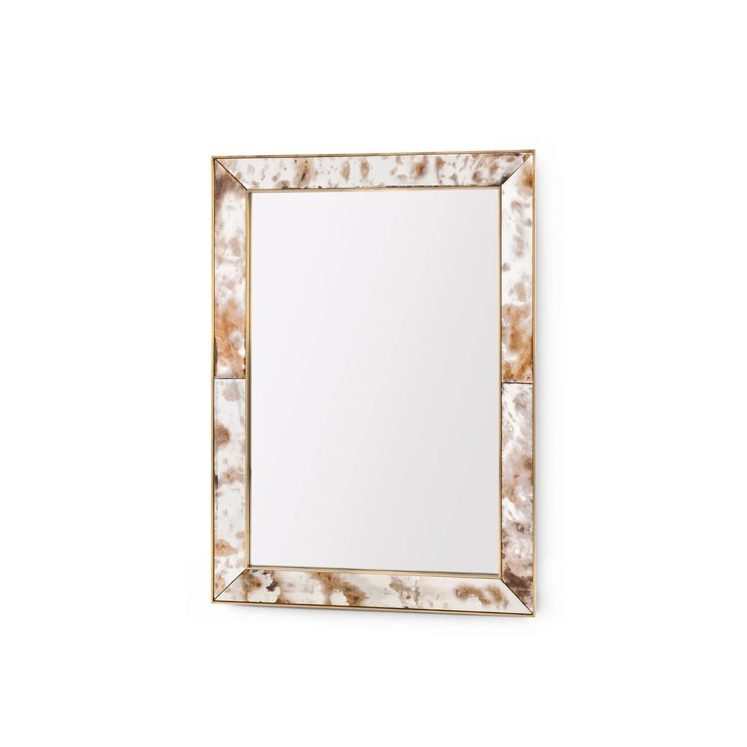 The Etienne Antique Mirror from Bungalow 5 exhibits skillful craftmanship using oxidizing techniques to create abstract patterns on the glass that resemble Jasper stone. The oxidized pieces are edged in solid brass then crafted into a romantic and unique wall mirror. Place the Etienne in hallways, entryways, and living spaces as a statement piece.