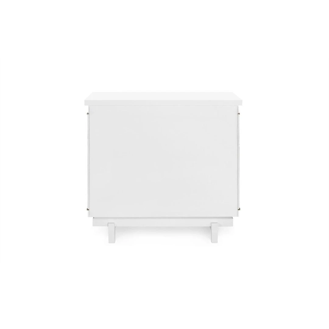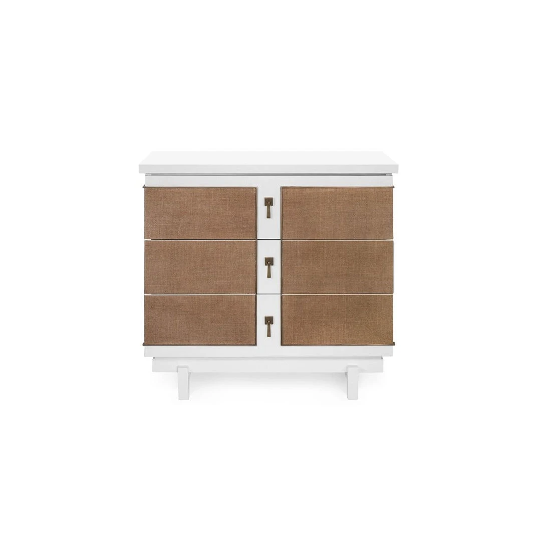 With high-end white lacquer, wrapped hessian panels, and signature Bungalow 5 bronze accents, the Grant 3-Drawer Side Table is a standout. Reminiscent of Frank Lloyd Wright’s design ethos merged with an abstract aesthetic, the Grant Collection is packed with luxury details. Notice the custom hand-cast pulls in a dramatic teardrop shape and the bronze piping that traces the perimeter of the white-washed hessian panels on both the front and sides of the side table. The drawers are finished on the interior with an oak veneer and feature soft closing glides. The feet, slightly obscured from view, are comparable to the eaves of a midcentury modern roof, grounding the piece. This white side table would be appropriate in a large bedroom, per its slightly oversized dimensions, or in a dining room as a serving cabinet or bar cart equivalent.