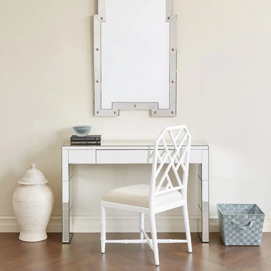The Jardin Side Chair in White from Bungalow 5 is handcrafted of solid mahogany in the Chinoiserie style and finished in a white lacquer. Stylish design details include an elegant faux bamboo frame, lattice frets, and tapered legs, giving the piece a sophisticated and graceful line. Simple drop-in linen upholstery recovers easily when it comes time for a change.Â