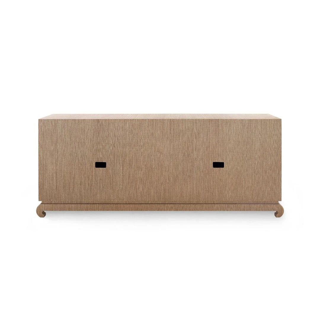 The Bungalow 5 Meredith Extra Large 4-Door Cabinet in Brown combines a solid geometric rectangular base with a whimsical and delicate curving chow foot. Showcasing gold finish ring pulls lacquered grasscloth and two adjustable shelves, this striking piece is versatile and stylish. Back panel openings conceal and organize cables making this the perfect piece of furniture for media rooms, great rooms or living rooms. Supported by gently curved Chow feet, the upscale Meredith also offers extra storage for other areas of the home or office.