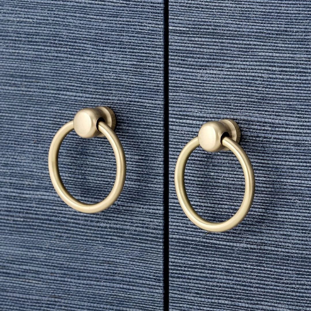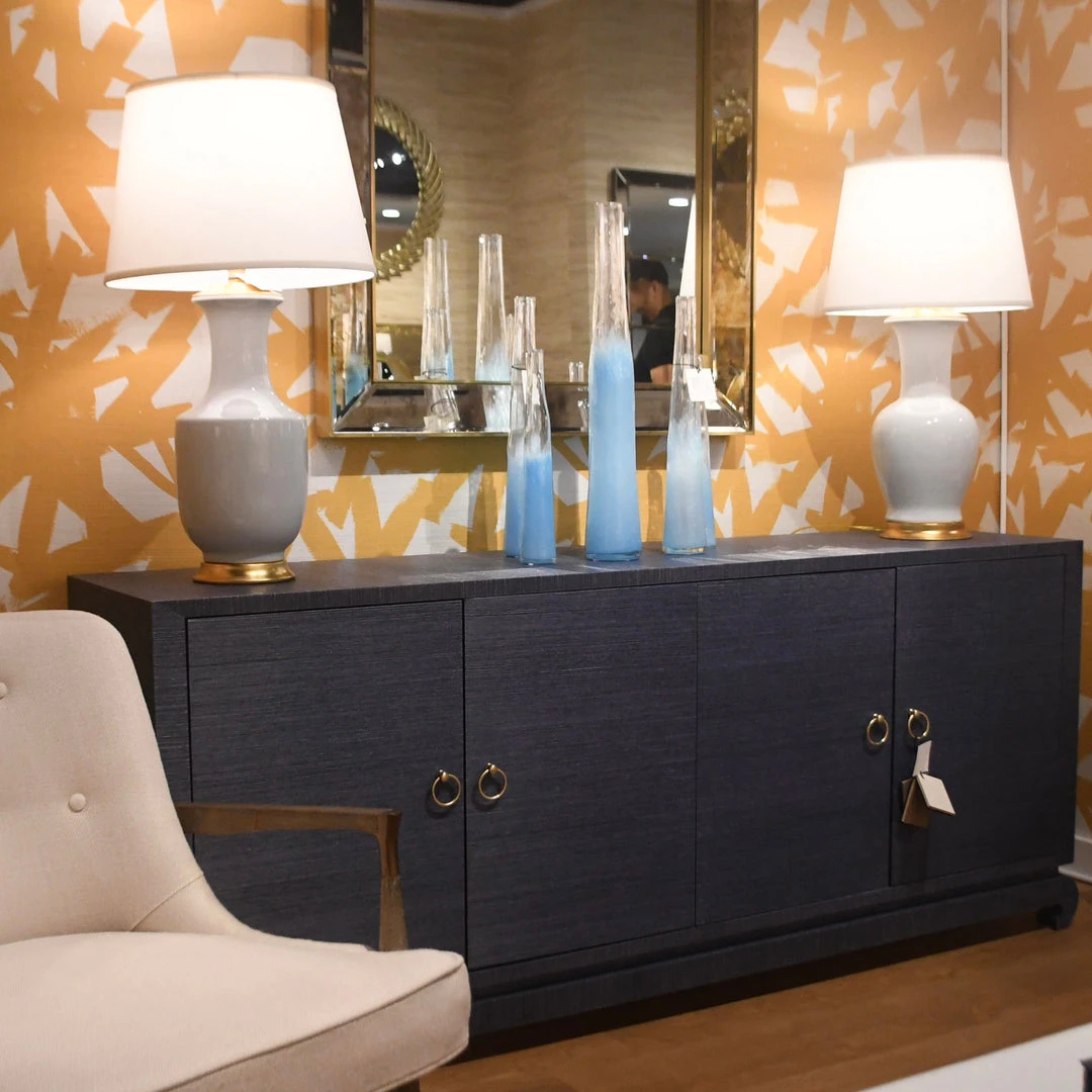 The Bungalow 5 Meredith Extra Large 4-Door Cabinet in Navy Blue pairs a geometric rectangular base with a whimsical and delicate curving chow foot. Featuring gold finish ring pulls, lacquered grasscloth and two adjustable shelves, this versatile piece is chic and stylish. Back panel openings conceal and organize cables making this the perfect piece of furniture for media rooms, great rooms or living rooms. Supported by gently curved Chow feet, the upscale Meredith also offers extra storage for other areas of the home or office.