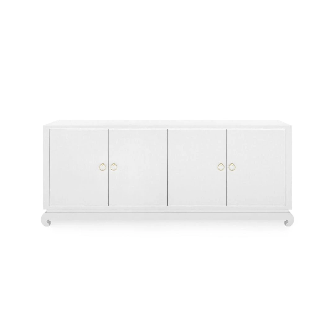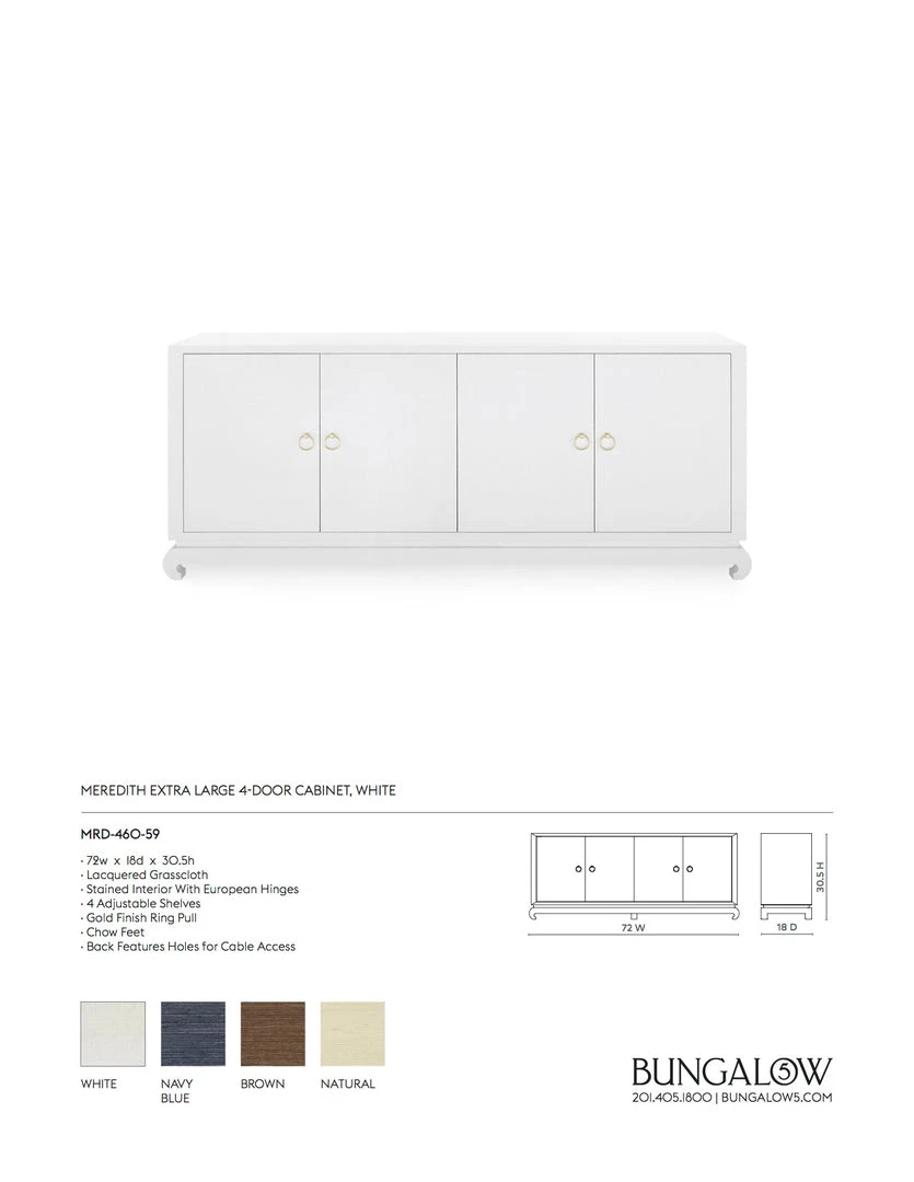The Bungalow 5 Meredith Extra Large 4-Door Cabinet in White pairs a geometric rectangular base with a whimsical and delicate curving chow foot. With gold finish ring pulls, lacquered grasscloth and two adjustable shelves, this functional piece is chic and stylish. Back panel openings conceal and organize cables making this the ideal piece of furniture for media rooms, great rooms or living rooms. Supported by gently curved Chow feet, the upscale Meredith also offers extra storage for other areas of the home or office.