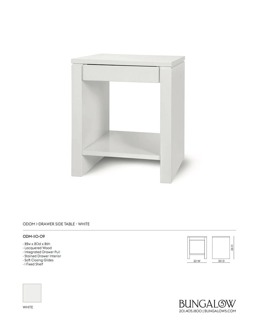 The Odom 1 Drawer Side Table in White from Bungalow 5 is polished, spare and modern. Considered details include a floating top and pretty reveals. Sophisticated shelves, drawers and a chunky leg offer a unique take on the basic side table. The Odom is the perfect accent table for a sleek modern living room or study.