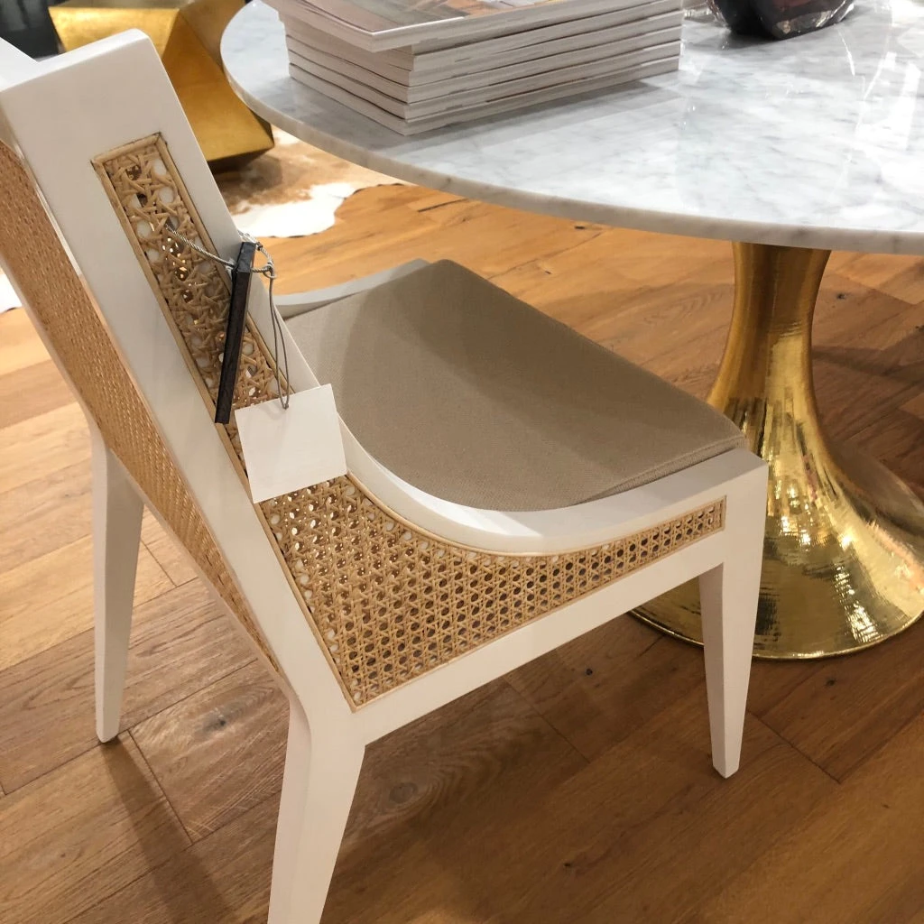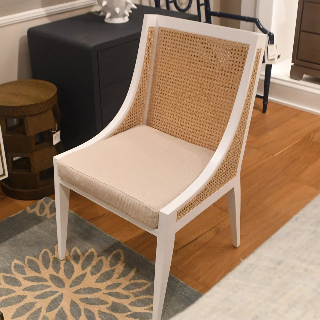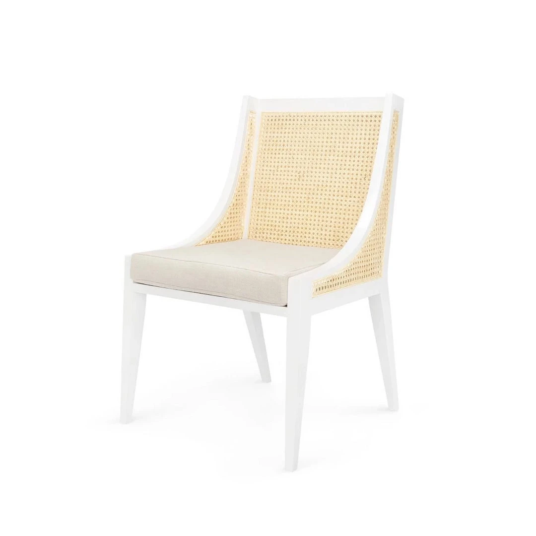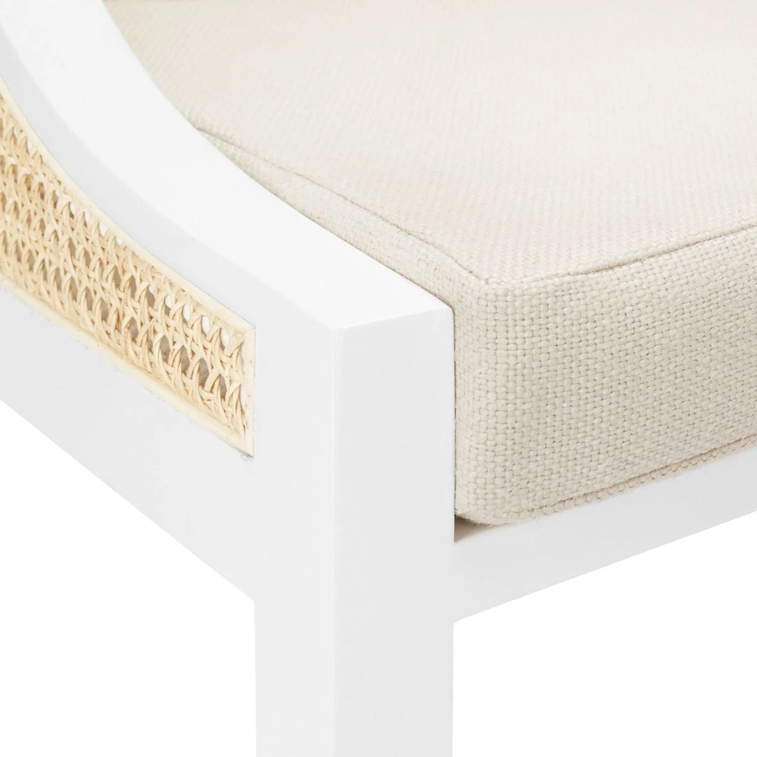 | Materials | White Lacquered Mahogany; Hand-Tied Bleached Caning; Linen Drop-In Cushion in Natural (Photo is for reference only, actual color can vary widely from lot to lot) |