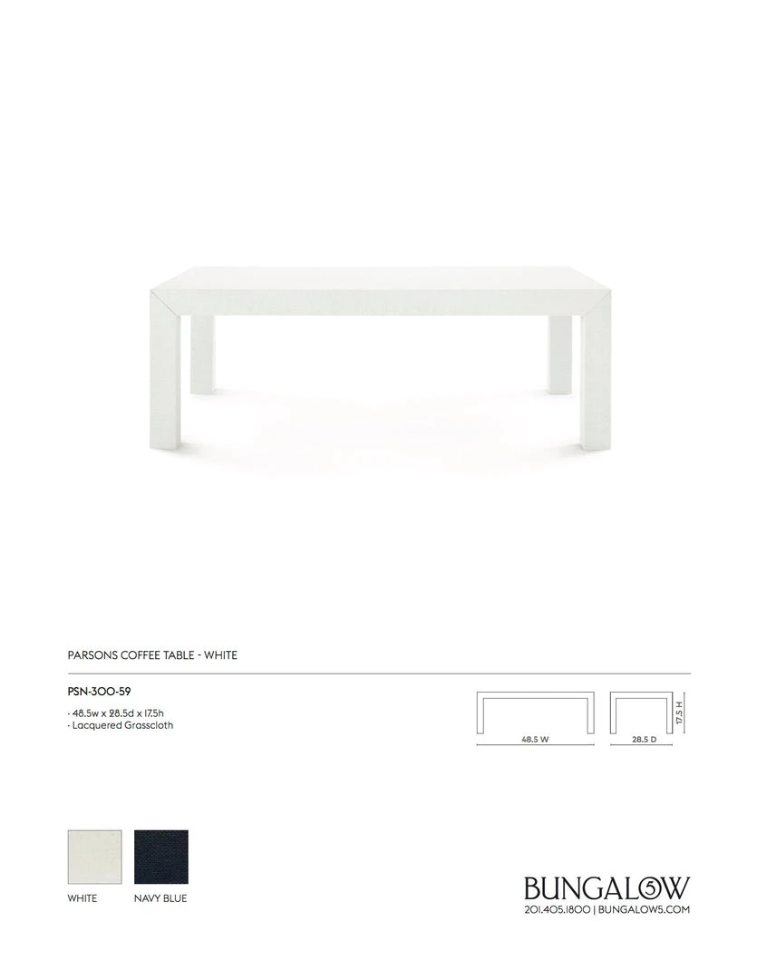 The Bungalow 5 Parsons Coffee Table in White is crafted in textured grasscloth in a classic Parsons shape. Combining architectural structure and natural texture, the sleek, rectangular design makes a striking statement in your living room or office.