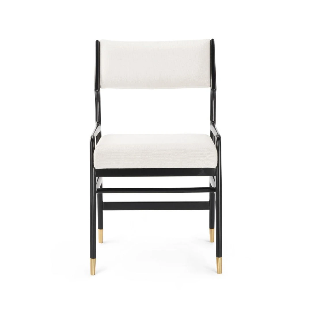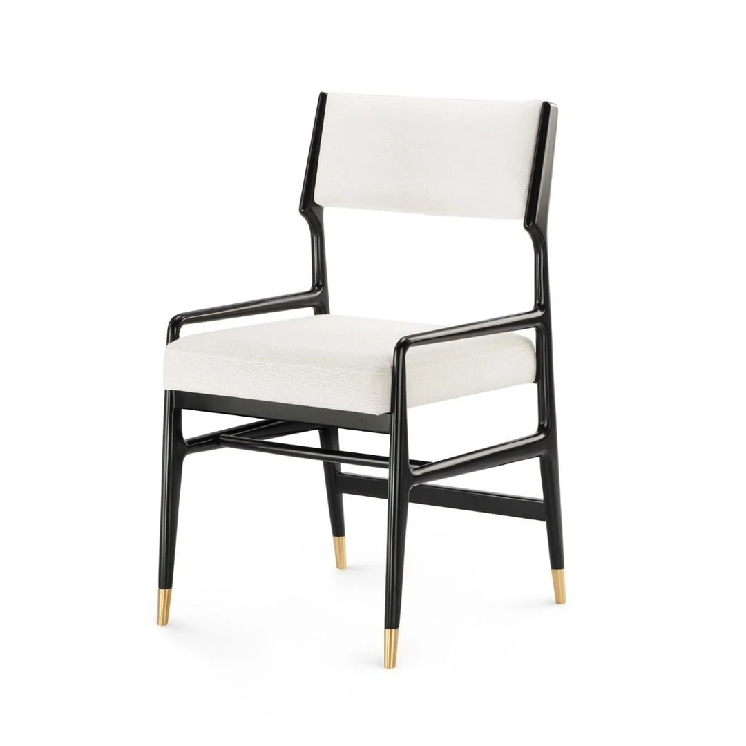 As an accent chair or dining set, the Tamara Armchair Chair from Bungalow 5 delivers an elegant expression of contemporary cool. Its relaxed refinement stems from its updated take on Scandinavian design, boasting a sleek frame of solid mahogany that showcases clean lines and subtle curves to embrace function and comfort. Its airy profile is marked by a floating back cushion, which matches its drop-in seat, and an architectural framework base that features alternating stretchers and gently tapered legs. An all-over black lacquer finish gives the Tamara a sense of chic minimalism, while polished brass sabots at its feet add a dash of glamour. The Tamara’s quality construction and modern aesthetic make it a seat that is as versatile as it is stylish.