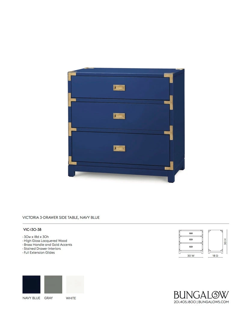 The Victoria Side Table in Navy Blue from Bungalow 5 delivers a striking accent piece with a nod to vintage style. Traditionally, European officers traveled with portable furniture reinforced with metal corners and edgings to withstand the rigors of the road. The Victoria is inspired from the shape and details of campaign furniture while updating the dimensions and the metal embellishments to shiny brass. Place the Victoria as a side table in the living room or family room or as a console in a compact entryway.