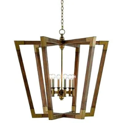 A nod to the current mid-century craze, the Bastian Lantern from Currey and Company incorporates the favored wood and brass pairing for a winning introduction. Strong geometric lines in rich Chestnut wood, capped with the worn brass, make this lighting perfect for foyers, dining rooms and bathrooms!