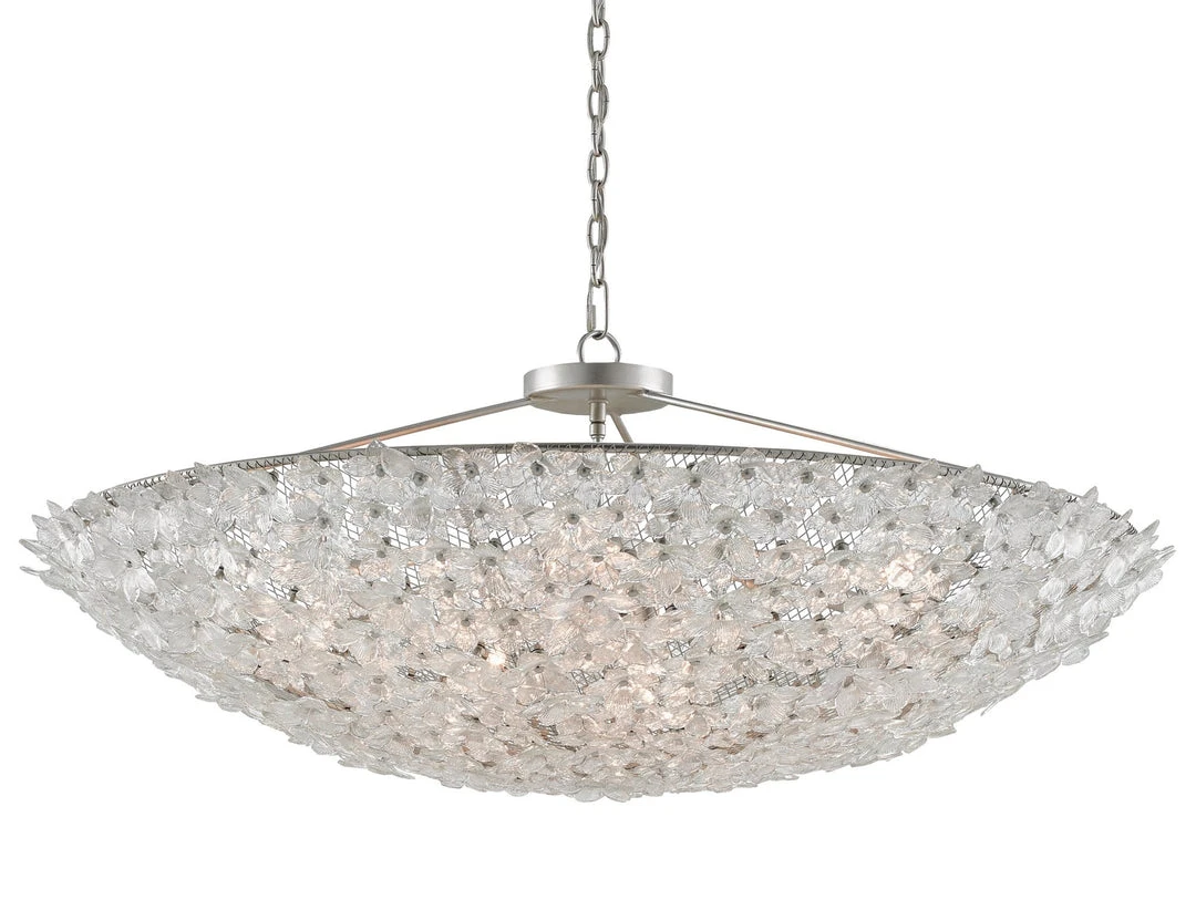The Currey and Company Belinda Chandelier is a large scale showstopper by Bunny Williams. Its dome form finished in painted silver features hundreds of gleaming glass flowers. The Belinda Chandelier is perfect as a dramatic feature in a foyer or dining room. Â