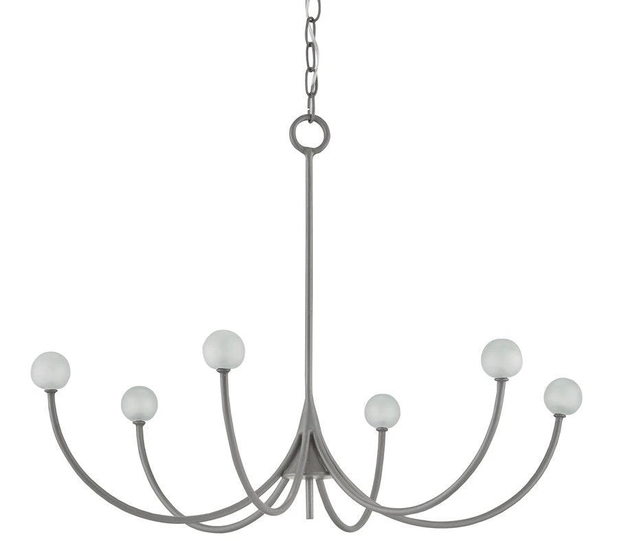 The Carew Chandelier from Currey and Company features a traditional chandelier shape and updates it with clean lines for a modern feel. The wrought iron in a Hiroshi Gray finish gives this gray chandelier an industrial feel. This chandelier works great in an entry, dining room or even bedroom as the design is complementary with all styles.