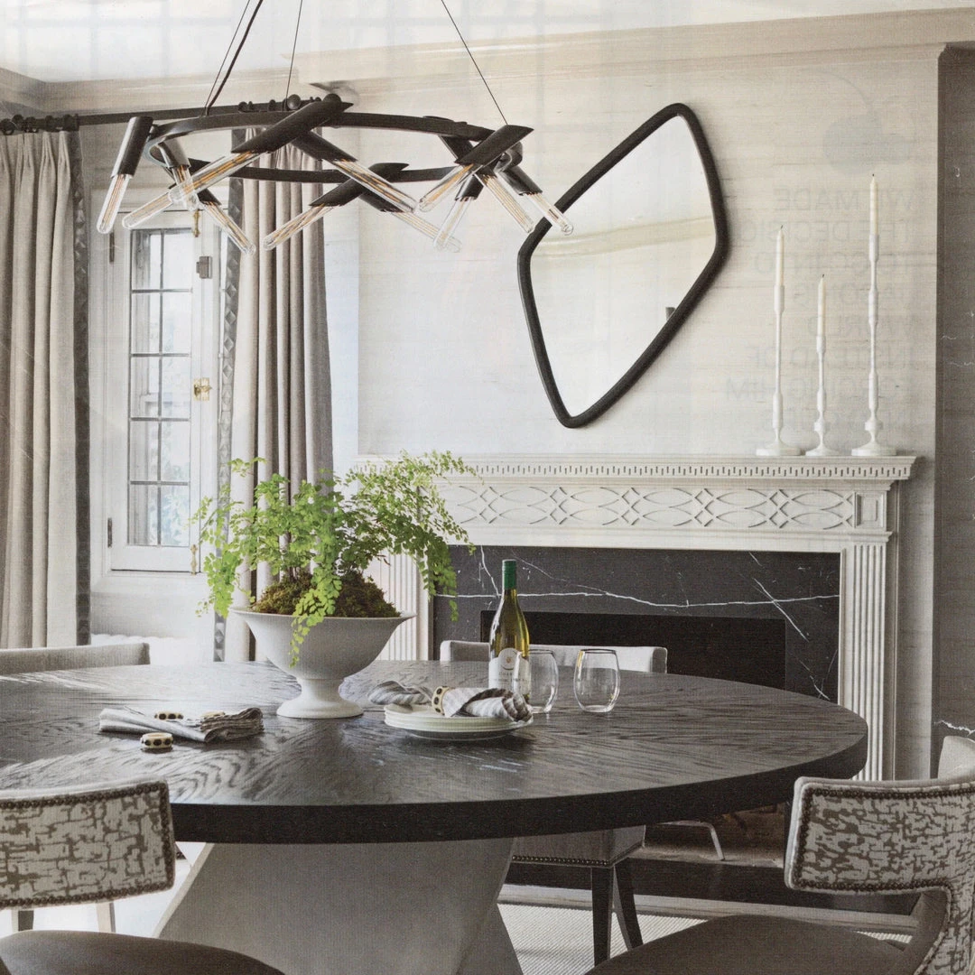 The Luciole Chandelier from Currey and Company features an oil rubbed bronze finish on its tubular bulbs. This design is sure to make a statement in your space with its industrial sleek feel. Chandeliers like the Luciole Chandelier are ideal for the dining room or foyer. As seen in Traditional Home magazine.