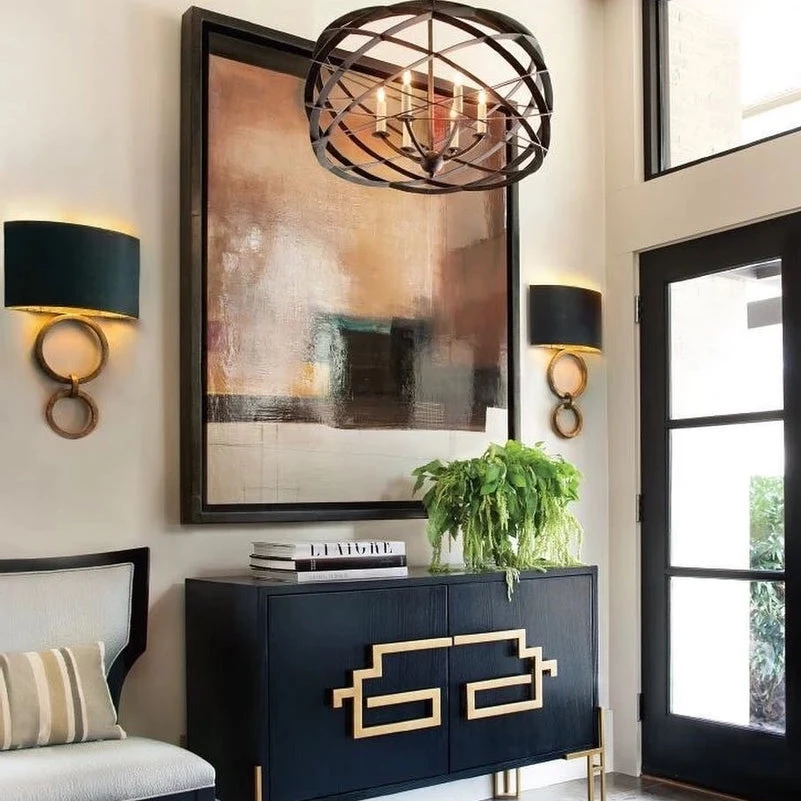 The Bolebrook Sconce from Currey and Company demonstrates that a textured patina can turn up the style volume. Its shade, finished in French black, makes an impact in contrast to the gold leaf finish of its linked-ring frame. This handsome sconce adds a touch of drama when place in pairs in the bedroom, entryway or dining room.