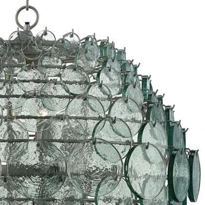 Recycled glass discs dangle from the wrought iron frame of the Braithwell Chandelier from Currey and Company to form a textural shade that turns the light emanating through it into a mottled mosaic. The discs vary in size and overlap to form this eco-friendly artistic statement. The metal of the 14-light fixture has been treated to a painted silver Granello finish that adds to its gleaming artistry.