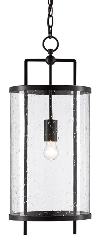 One of the strongest design statements the Chesten Pendant from Currey and Company makes is the contrast between the deep black metal and the sheathes of seeded glass. Made of wrought iron in an antique black finish, the canister-like black pendant frames the seeded glass while a cleverly placed rectangle of metal creates the armature that holds the light bulb.
