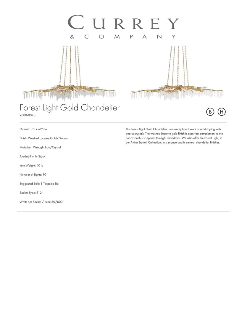 Currey & Company delivers the simply stunning Forest Light Chandelier, dripping with white quartz pendants that are suspended on washed lucerne gold chains! This exceptional lighting, a decadent objet d’art, transforms any space in the home from the foyer to the bedroom to the dining room.