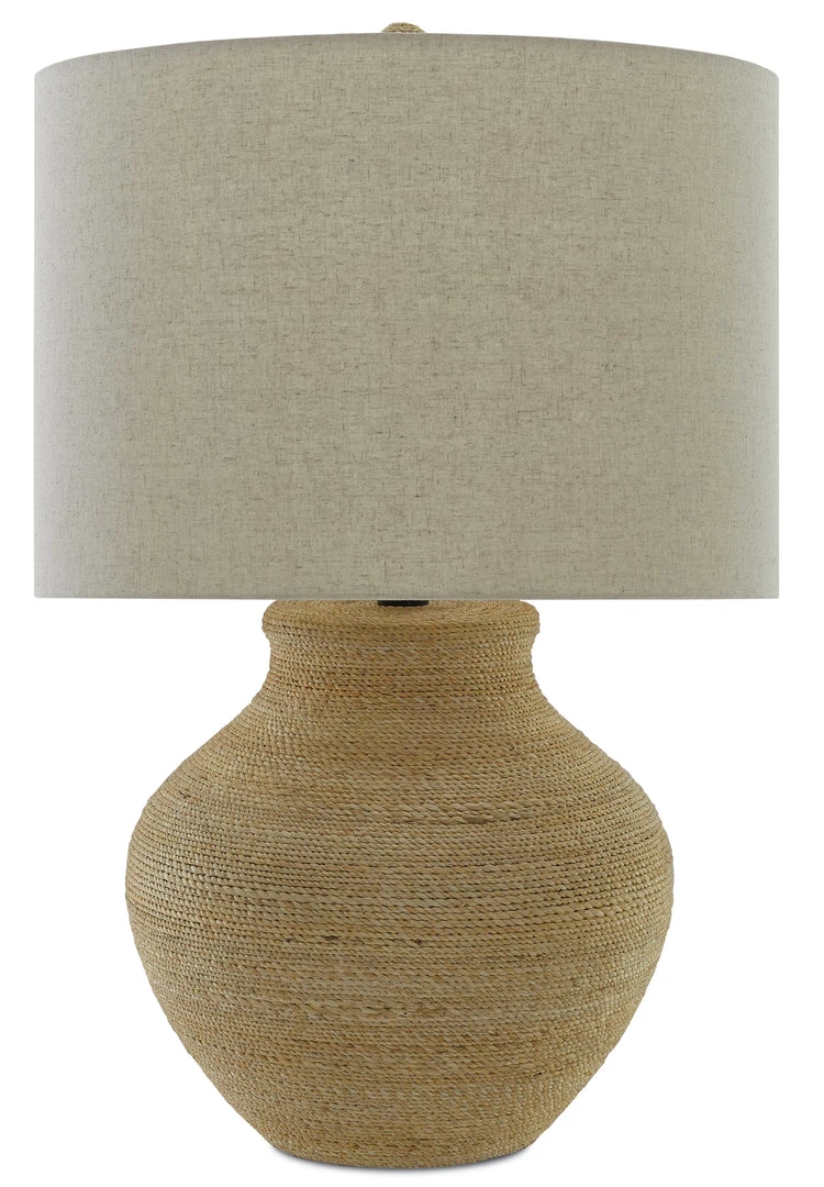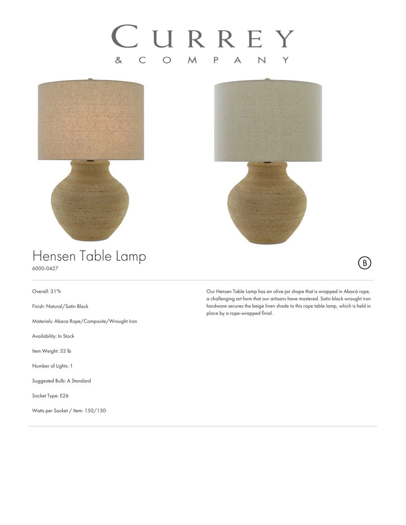 Currey and Company presents the Hensen Table Lamp, conjuring thoughts of sea breezes wafting into the room. The Hensen has been thoughtfully wrapped in Abaca rope and finished in wrought iron. Highly skilled artisans create seamless surfaces and a unique piece. Satin black wrought iron hardware holds the beige linen shade in place, which is topped with a rope wrapped finial.