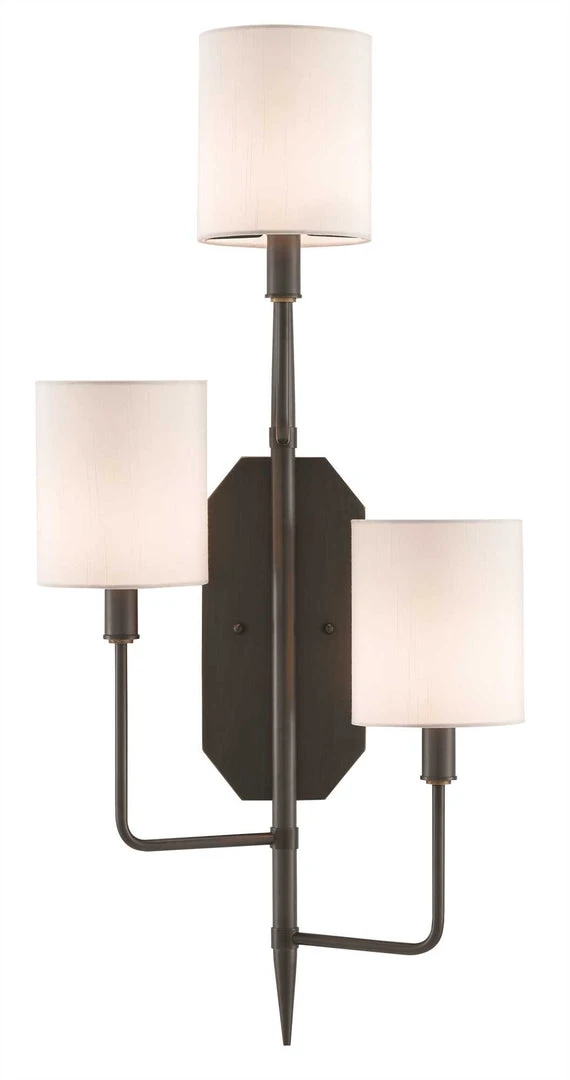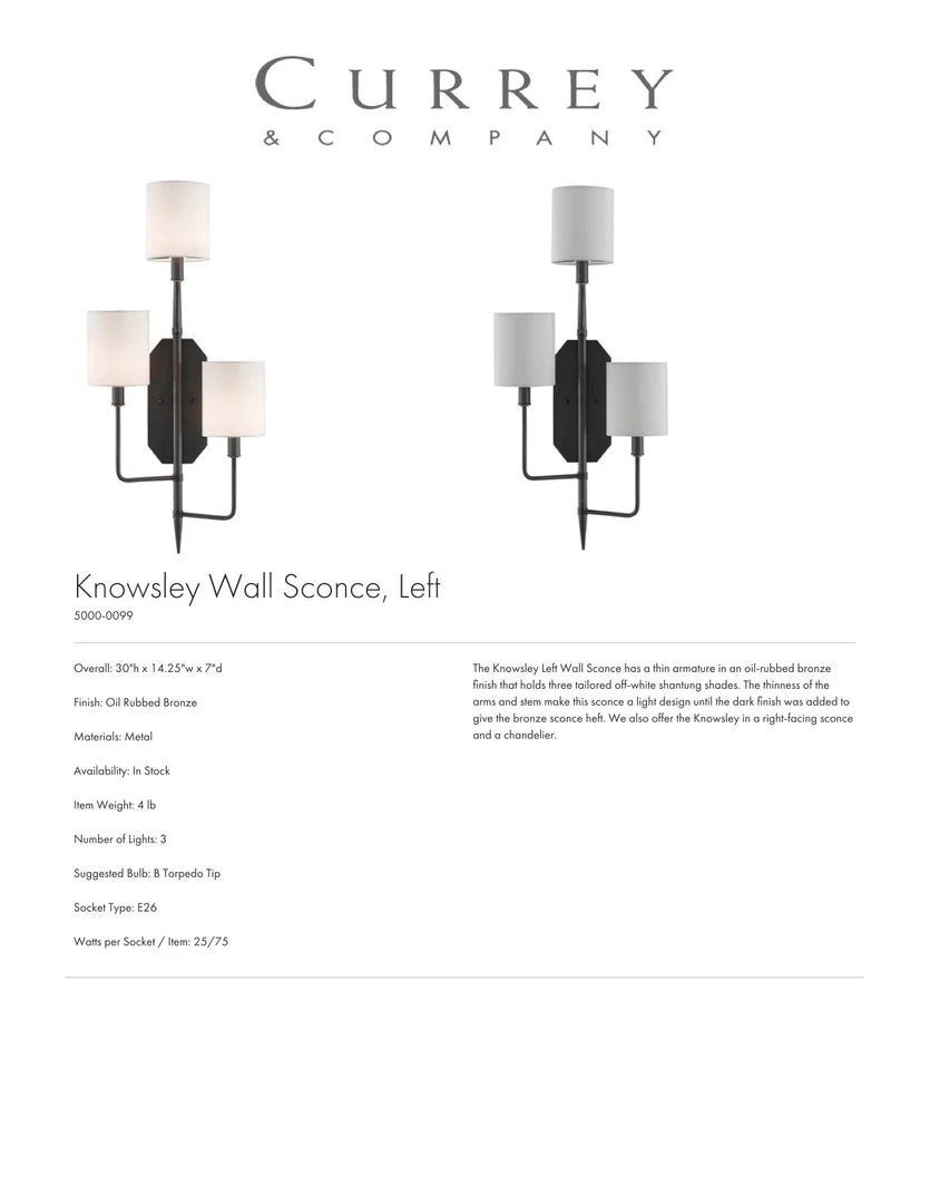 The Knowsley Wall Sconce from Currey and Company showcases restrained design and a noble personality.  The Knowsley is designed with a straight stem and three tailored off white shantung shades and finished with an oil rubbed bronze finish. This versatile sconce is equally at home in a handsome den as it is in an elegant boudoir. For flanking headboards or fireplaces, we offer a right and a left sconce in the Knowsley.