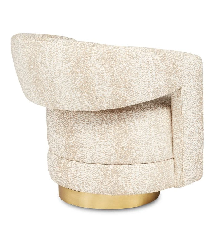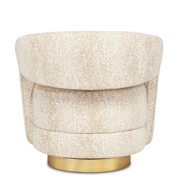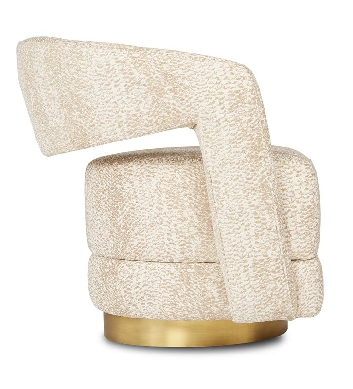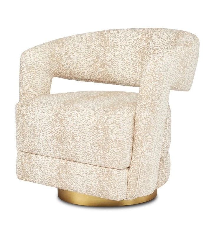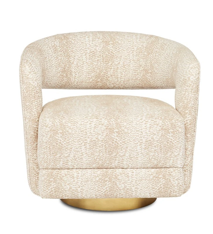 The Maren Swivel Chair in Wild Natural from Currey and Company is a tub-back chair with a chic opening in the back that makes the back panel appear it is floating. The ivory chair is covered in a fabric with a very subtle abstract cheetah-like pattern in neutral tones; and has a gold base and a 360-degree swivel, which makes it perfect for the space where interior conversations and outdoor views can be enjoyed from the same spot.