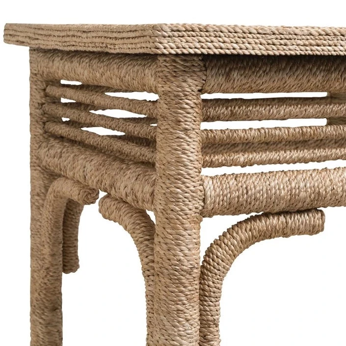 Currey and Company offers a fresh take on using natural woven materials in the home or vacation retreat with its rectangular Olisa Console! Featuring a braided Abaca rope wrapped table gives modern sensibilities an alternative to the usual rattan and wicker.