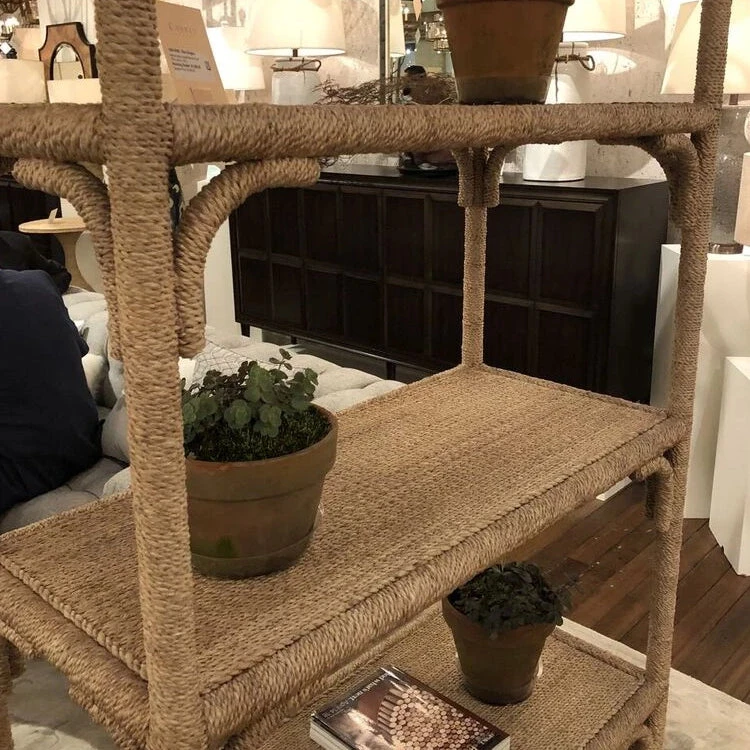 The Olisa Etagere from Currey and Company delivers the organic feel of rattan and wicker to your home. The Olisa is fully wrapped in braided Abaca rope bringing a noteworthy statement in an oceanfront retreat or in a lovely lakeside residence. Shelving units like the Olisa Etagere impart charm and unique style to foyers, dining rooms, and home offices. As seen in Veranda magazine.