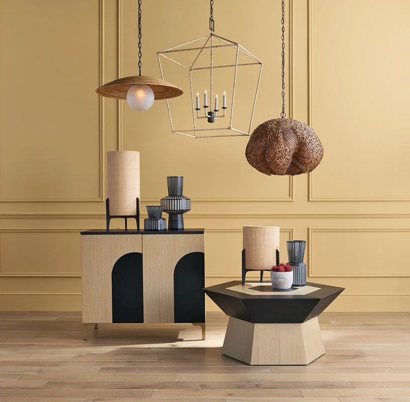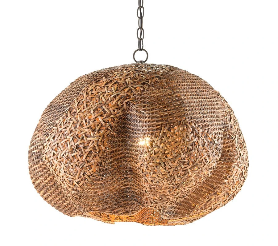 Inspired by woven bags in Paris, the Spiritus Pendant from Currey and Company is stitched in a mix of wicker and rattan. A detail of note is how the shade is not perfectly woven. This is by design, as the larger strands of rattan are stitched into the more uniform wicker strands to form organic shapes that bring the shade even more texture than it would have had if it had been made from one material. The metal hardware on the Spiritus is in a Carafe Brown finish.
