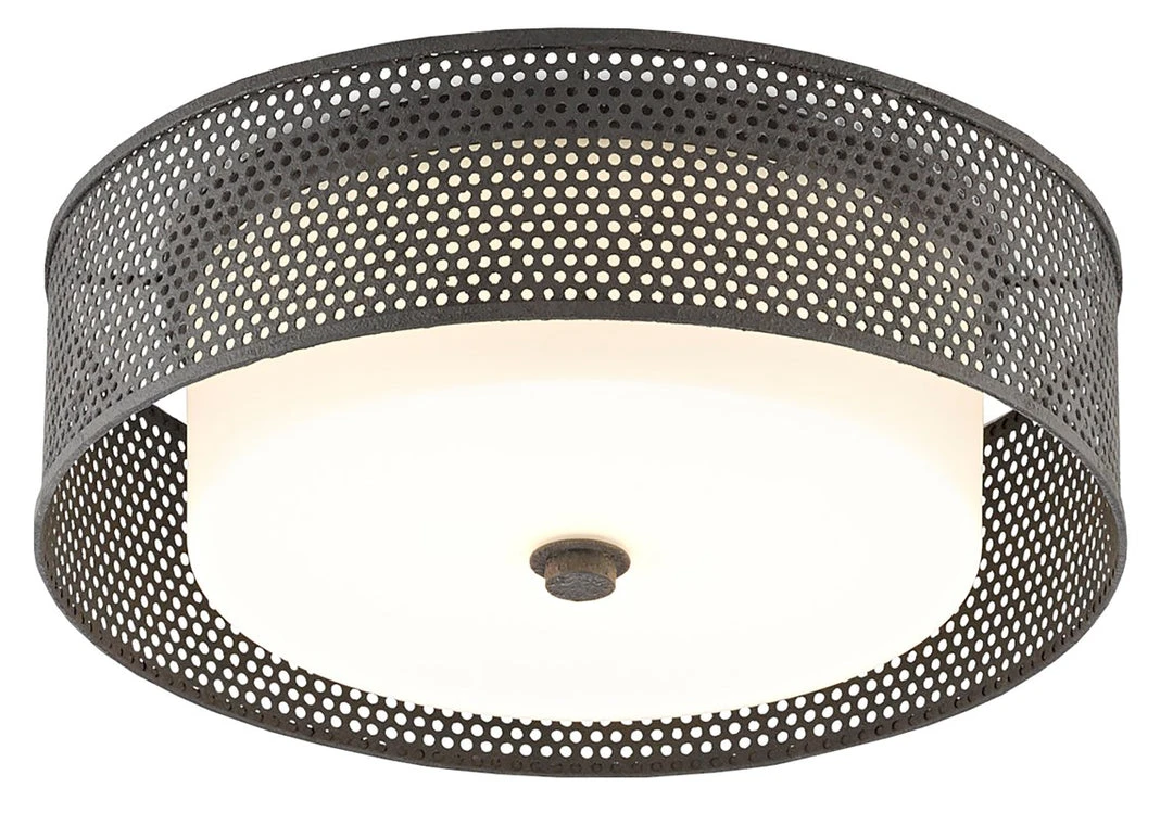 The Notte Flush Mount from Currey and Company delivers industrial chic style to your home. Made of wrought iron that has been treated to a Molé black finish, the shade has been punched. When illuminated, the circles will throw patterns onto surrounding surfaces making this flush mount a true statement ceiling light. The acrylic white diffuser is held into place by a simple finial, also of wrought iron in a Molé black finish.