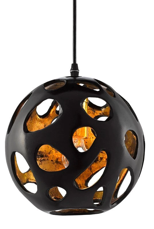 The Pursley Pendant from Currey and Company features organically shaped punctures in its ball-shaped shade is made of aluminum. The exterior of the pendant is in a bronze finish and the interior is luminous in a bright gold finish. This pendant light is ideal placed in multiples over a kitchen island or down a hallway.