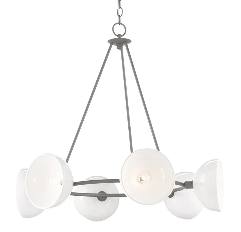 Simplicity is one of the strengths of the design of the Soba Chandelier from Currey and Company. Made of wrought iron in a Hiroshi gray finish and white porcelain, the thin tripodal stems of the gray chandelier extends down to a ring that holds its white, noodle-bowl-inspired shades. This design can easily swing from industrial chic to modern farmhouse style.Â