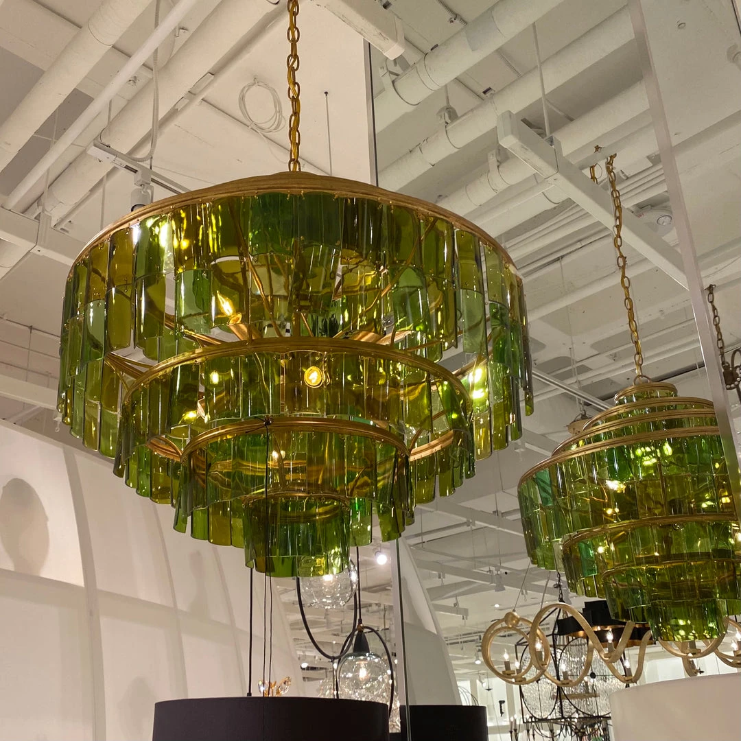 | Materials | Wrought Iron; Dark Contemporary Gold Finish; Bottle Glass; Green; Requires Eight 60watt Candelabra Bulbs (extra chain available on request) |