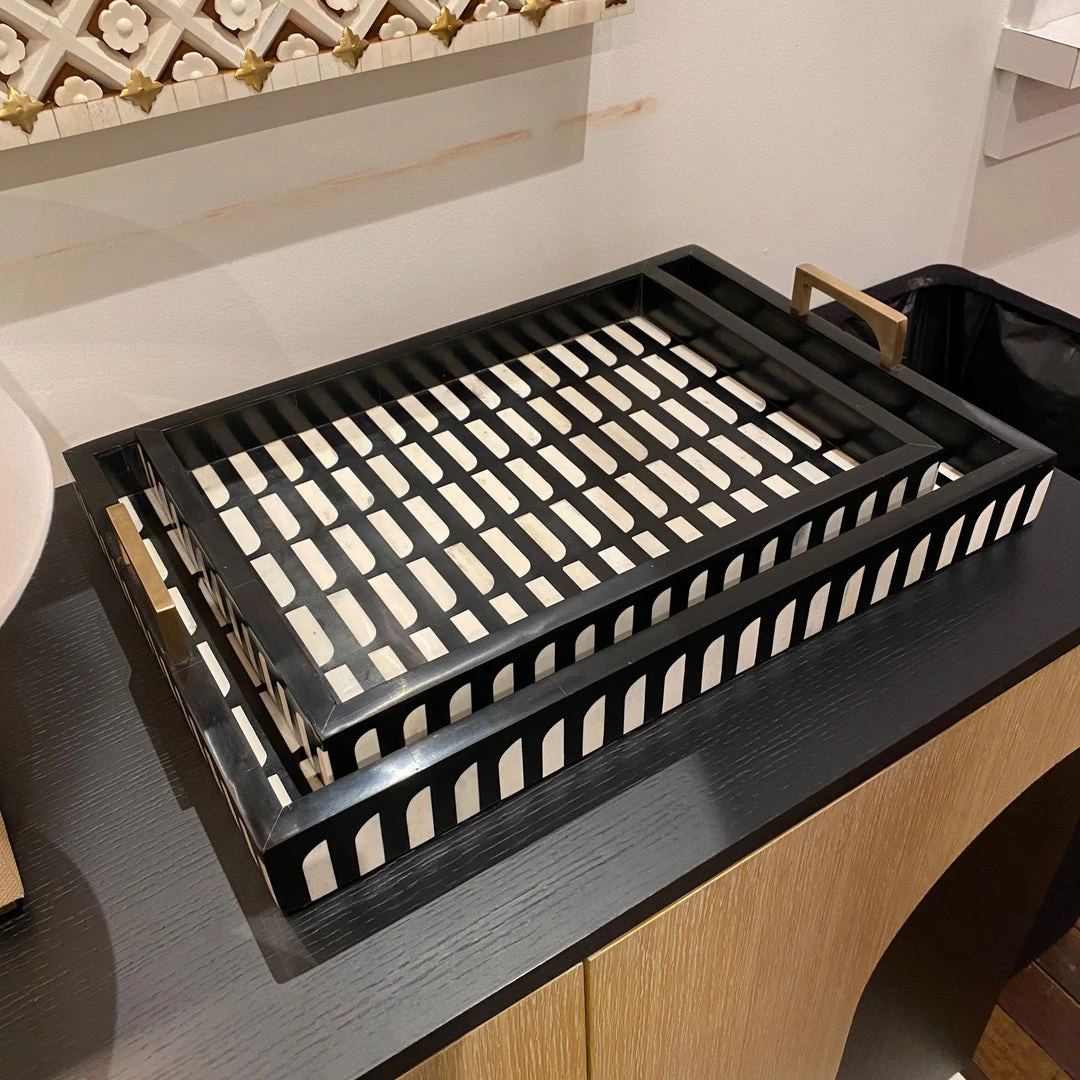 Currey and Company showcases the Swoop Tray Set of Two, designed by Jamie Beckwith. The design is based on a strong graphic shape that comes alive with the contrasting of pieces of bone and composite in ivory and black along the surface. Originally created in bold patterns for vertical and horizontal surfaces, Beckwith says of the Swoop, “I was inspired by mid-century design, specifically Italian designer Gio Ponti, when creating the Swoop pattern. I especially like the idea of curves with straight lines found in Swoop. There is a feminine but masculine feeling to these designs which work well in many environments, and that is due specifically to the shape.