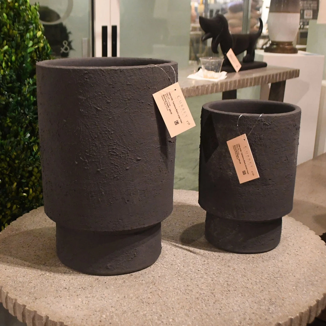 The Tambora Black Vase from Currey and Company is made of terracotta in a black ash finish. The round pitted surface has a primitive feel to it that will make this the perfect accessory for industrial spaces or interiors designed with dressed-down vitality. Available in a large or small size, display these vases together for a designer look.