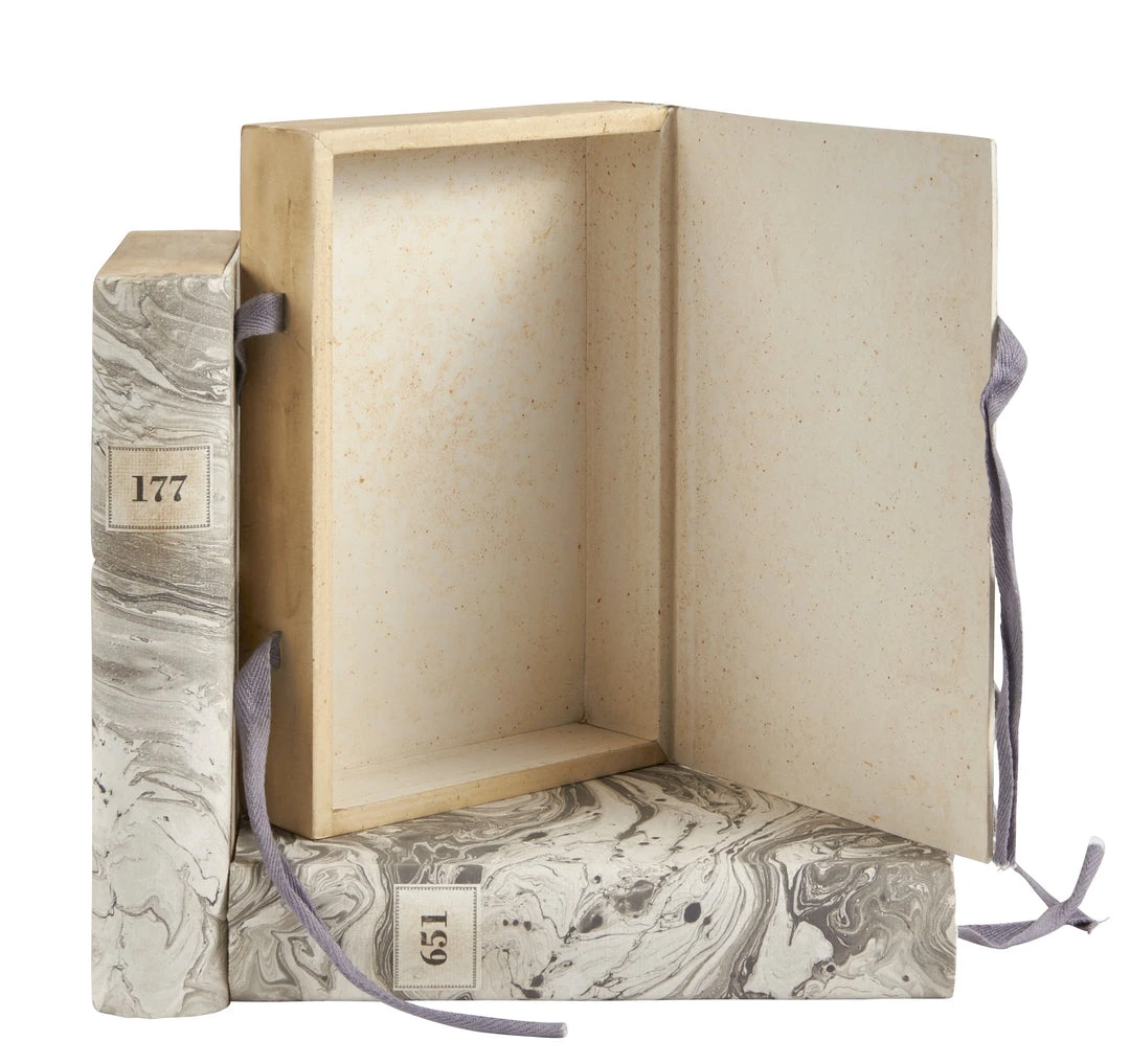 The Hand Painted Gray Marble Box Set of Three from E Lawrence features a unique and stylish storage option for shelving and desktops alike. This three-piece set of hand-painted marble book boxes are treated to a swirly grey finish with ribbon ties. Extremely unique, this stylish box set is the perfect hostess or housewarming gift.