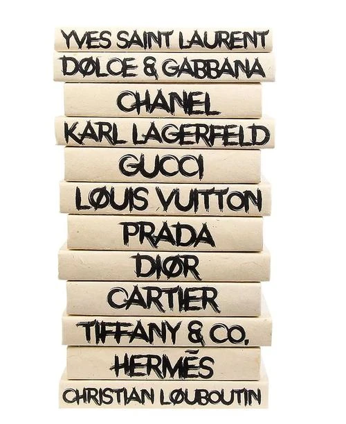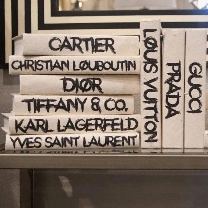 Fashions fade but style is eternal – YSL. Bring home the top fashion houses in the new modern script font in black lettering. The set of 12 books look great lined up altogether on your coffee or side table. These recycled books have been given new life in the best possible way. Fashion and Home have always overlapped and now you can show guests your personal style. The entire set includes Yves Saint Laurent, Dolce & Gabbana, Chanel, Karl Lagerfeld, Gucci, Louis Vuitton, Prada, Dior, Cartier, Tiffany & Co., Hermes and Christian Louboutin. Â *Made to order. Please allow 3-4 weeks for production.