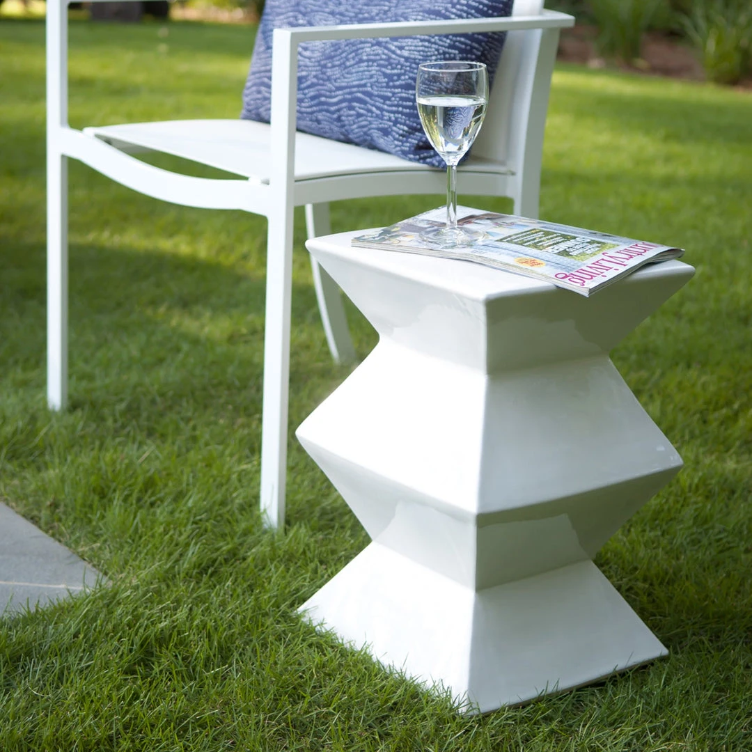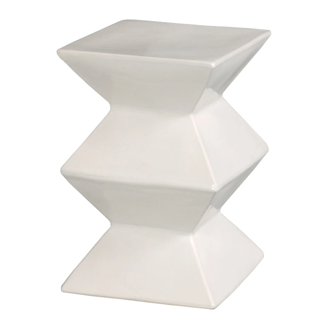 The Emissary Zig Zag Stool in Glossy White Glaze infuses a touch of bold, modern style into your indoor or outdoor decor. With its compact geometric shape, this glossy ceramic piece has a sleek and versatile shape that serves well as either a seat or a side table.Â