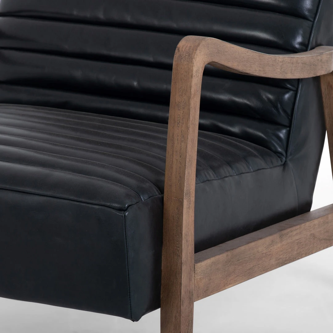 The Chance Chair in Dakota Black Leather presented by Four Hands offers a dramatically shaped mid-century frame paired with on-trend channel tufting. Black, top-grain leather contrasts with natural parawood. Elegant color and texture bring sophistication to this classic shape with clean lines and just-right sizing.