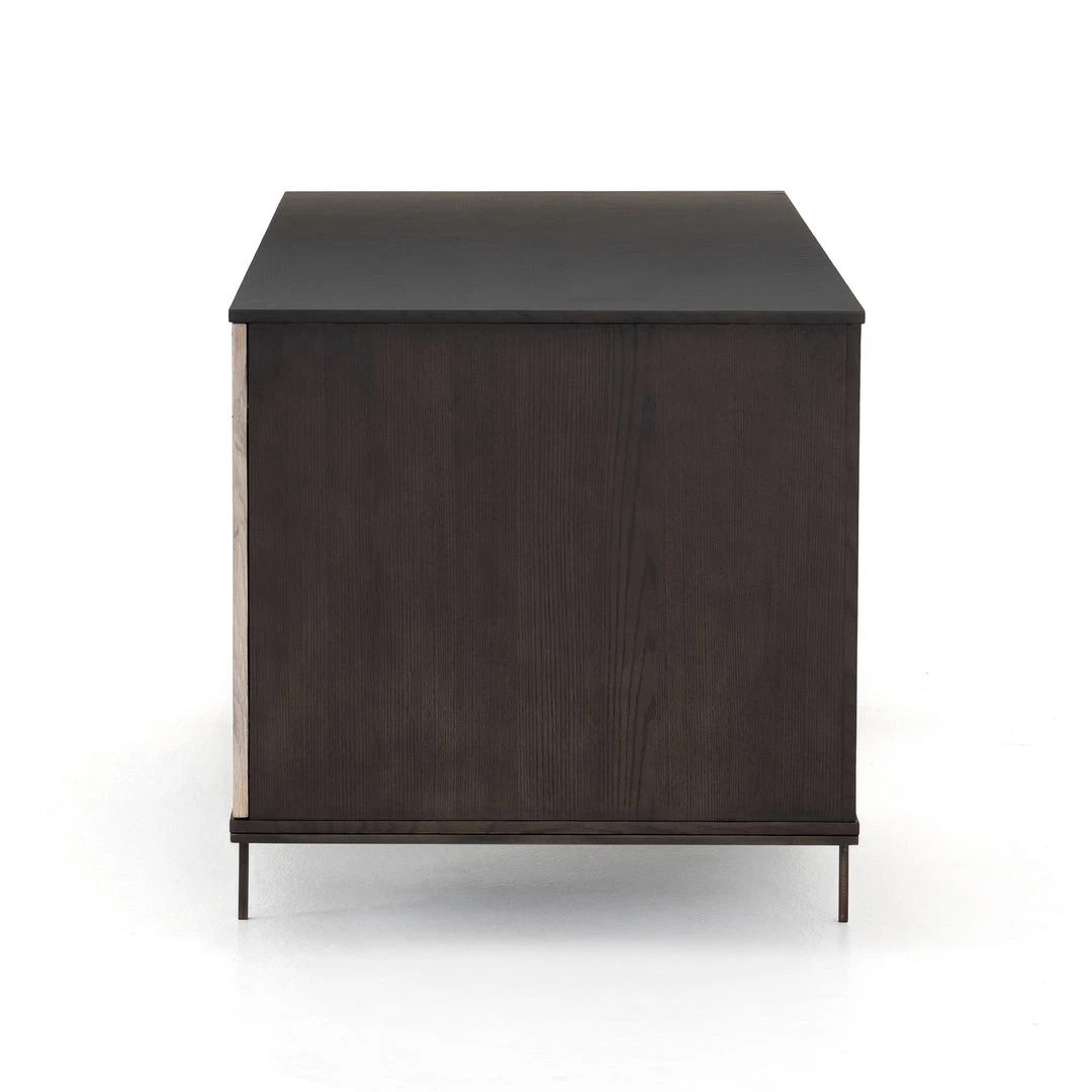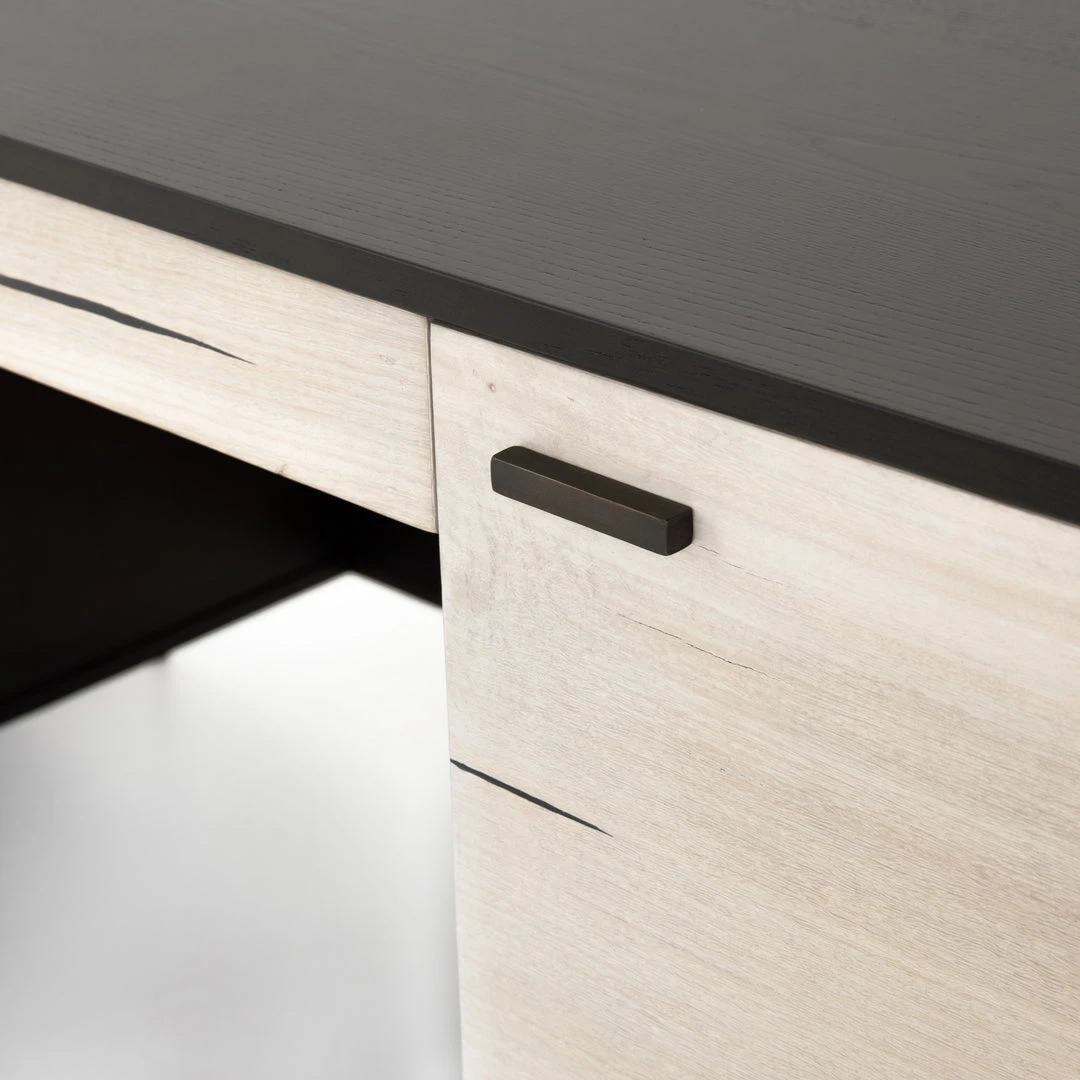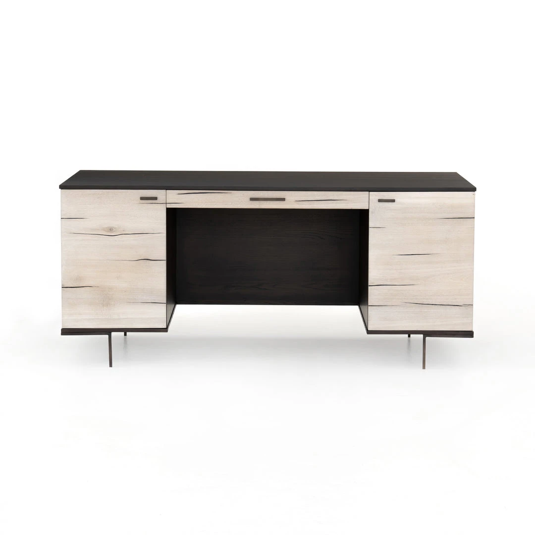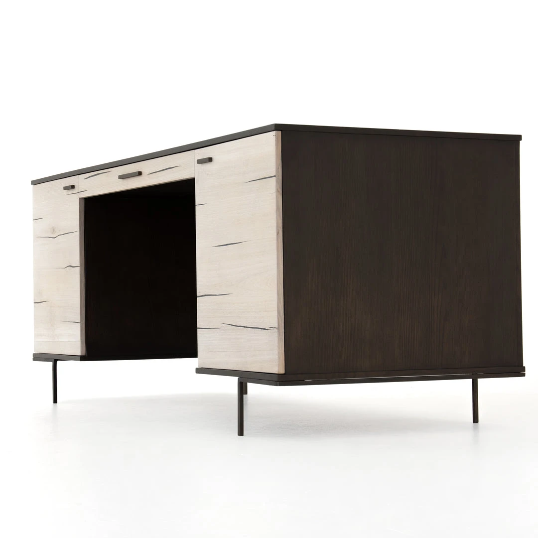 The Cuzco Desk in Bleached Yukas from Four Hands features slender legs of gunmetal-finished iron supporting a black ash frame, as resin fills the natural graining of bleached yukas. Center drawer and side cabinetry offer plenty of space for convenient office storage. Pattern and depth of resin lowlights and highlights vary from piece to piece, due to wood species’ inherent nature.