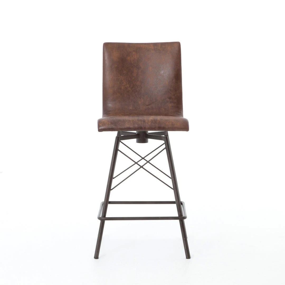 The Diaw Counter Stool from Four Hands features faux leather and a black iron base delivering an architectural design to your home. The mid century styling of the Diaw is a seamless addition to your kitchen or home bar. Modern S curves in a distressed brown faux leather swivel 360 degrees above a shapely, black waxed iron base. *Leather coloring will vary.