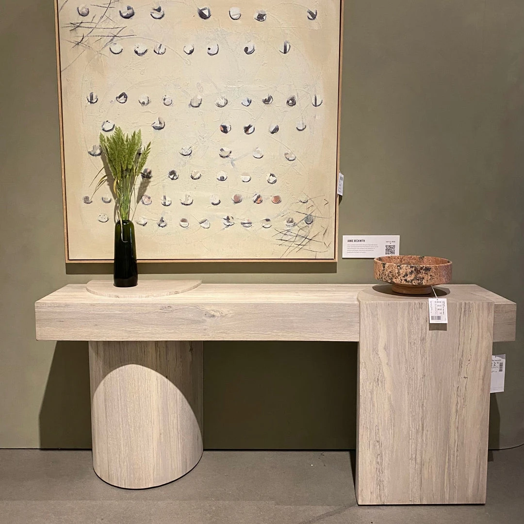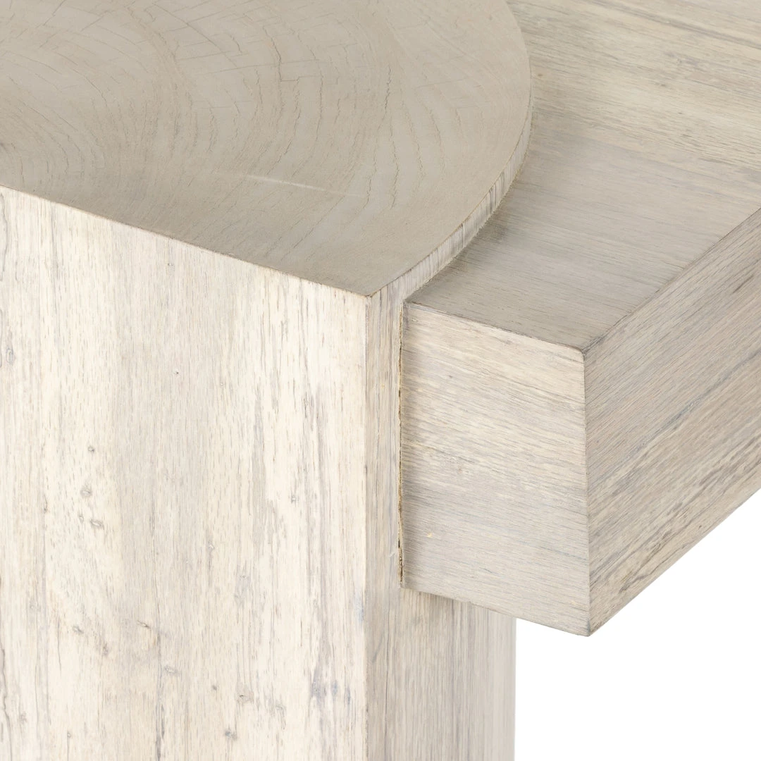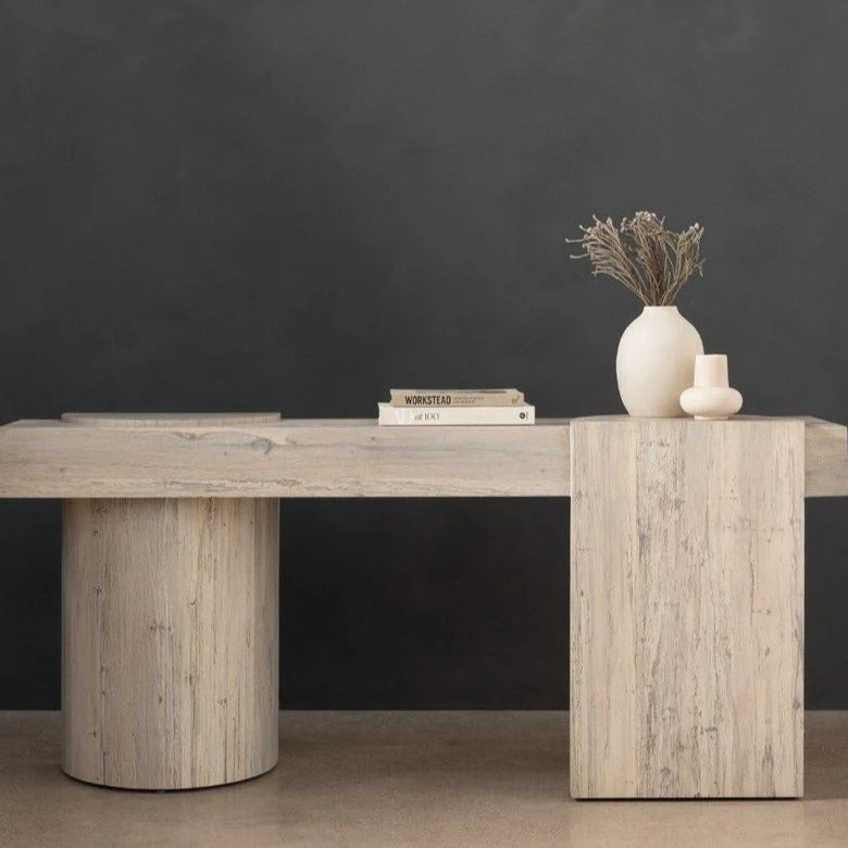 Made from thick-cut bleached oak veneer, the Georgie Console Table in Bleached Spalted from Four Hands features an asymmetric base with pillar-style legs, and has a plank-style top. The result: a show-stopping silhouette.