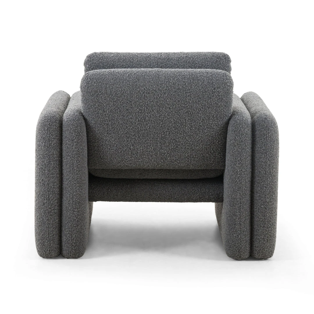 The Kimora Chair in Charcoal Natural from Four Hands features a sense of Eighties-inspired drama. Doubled channeling adds a layered, linear look to boucle-upholstered seating, with loose feather-fiber blend cushioning for comfort. The Kimora adds designer style to living spaces, offices, and bedrooms alike.