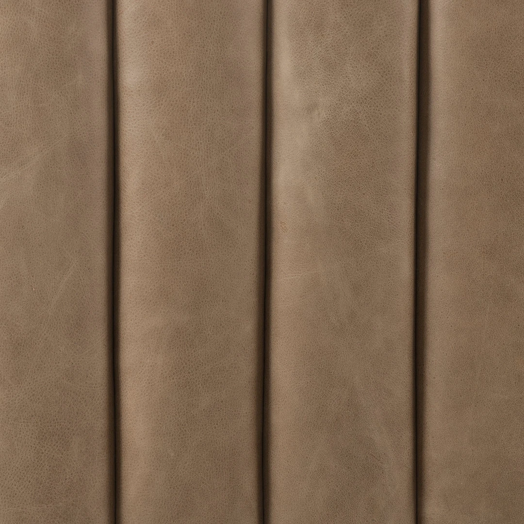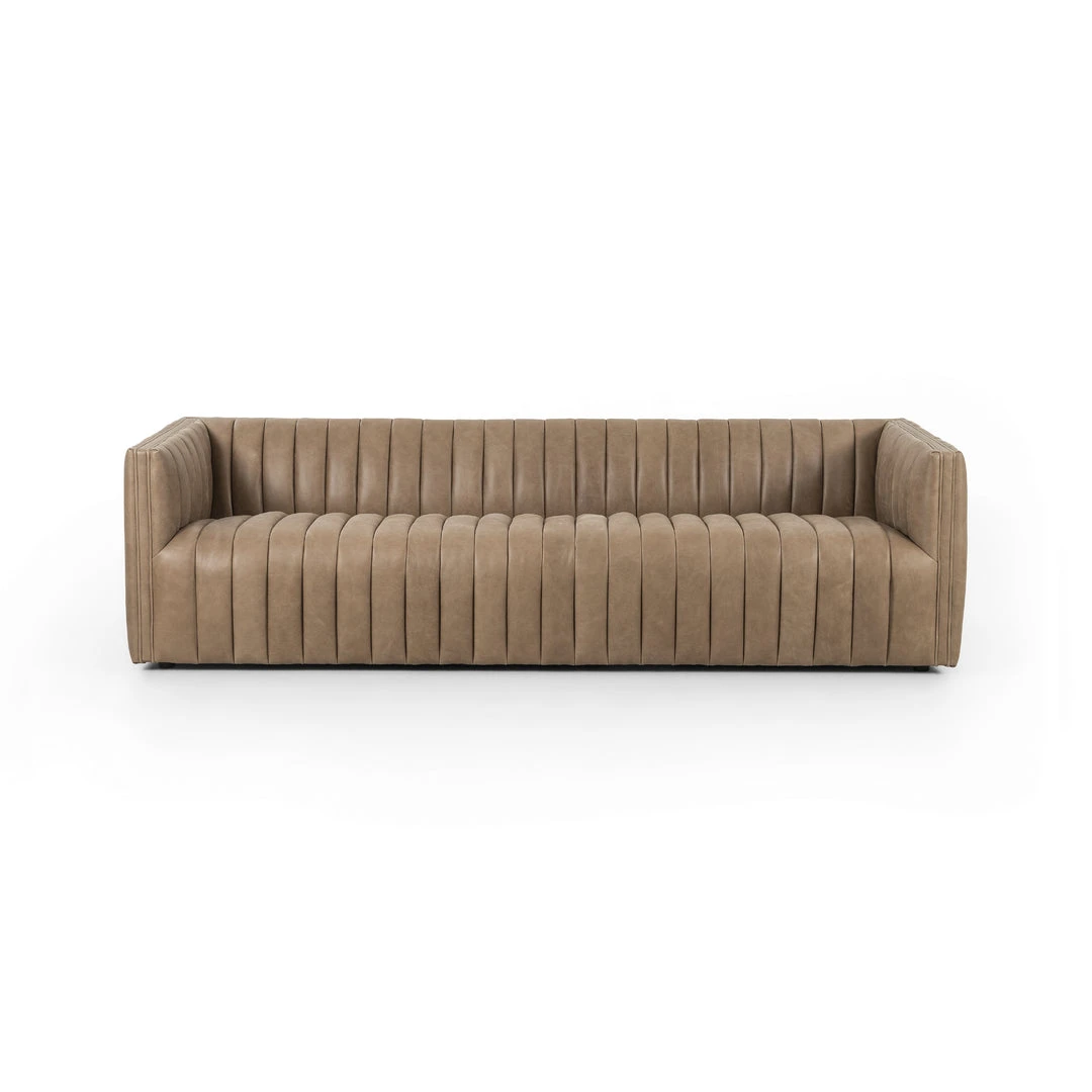 The Augustine Sofa in Palermo Drift Leather from Four Hands features dramatic channeling and deep tufting delivering generous depth to curvy, expertly-upholstered seating styles. The angular shape is the perfect complement to modern and contemporary decor schemes.