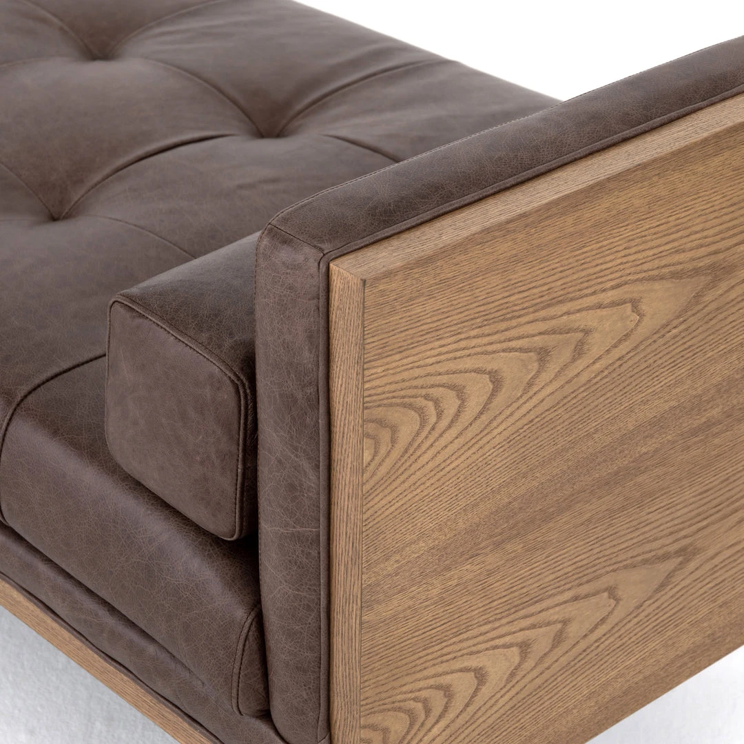 Four Hands showcases the Holden Chaise in Sonoma Coco delivering mid-century swank modernized by mixed materials. Toasted ash casing contains exclusive top-grain leather, cocoa in color and lightly tufted for comfort. Oxidized iron legs and lumbar pillows offer a forward-thinking finishing touch. Place the Holden in living spaces, bedrooms and entryways for stylish design and comfort.