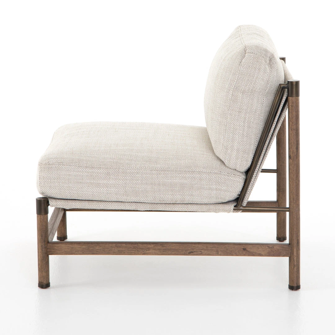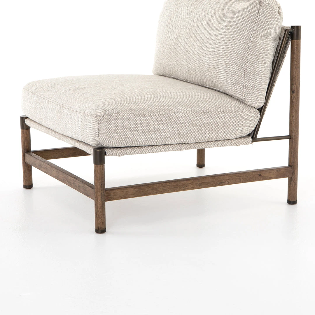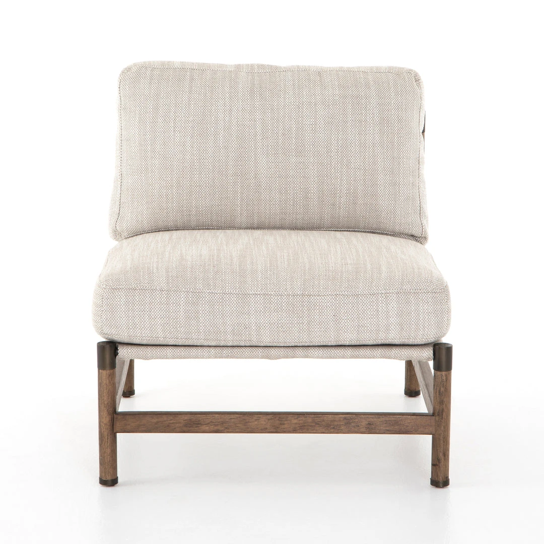 The Memphis Chair from Four Hands is seamlessly well-tailored. Framed by distressed parawood with bronzed steel caps, this laid-back armless seating style is upholstered in taupe performance-grade fabric