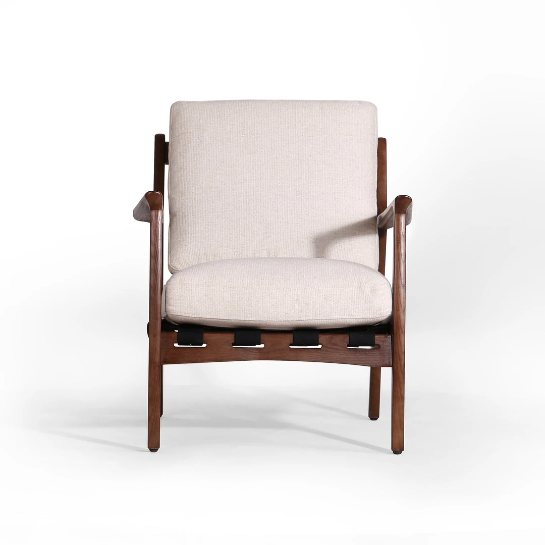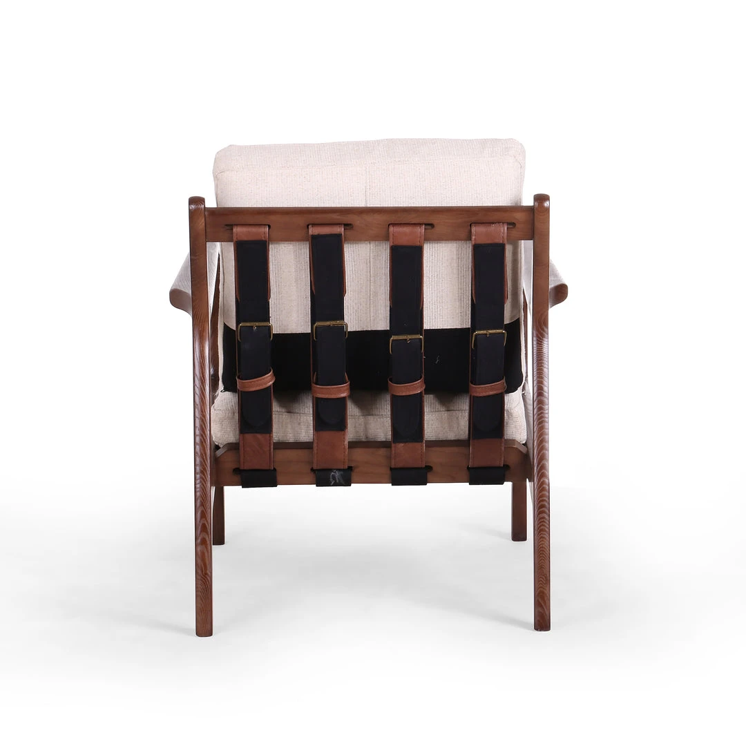 The Silas Chair in Osaka Blanco from Four Hands features a striking silhouette with design forward details at every angle. Textural seating of off-white rests within espresso-finished ash framing held by parachute strapping made of canvas, leather, and metal buckles.
