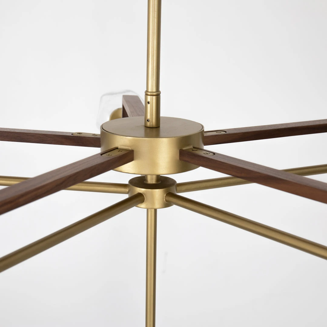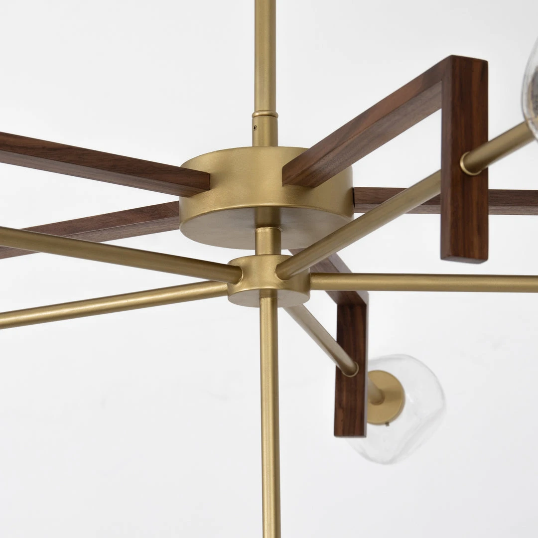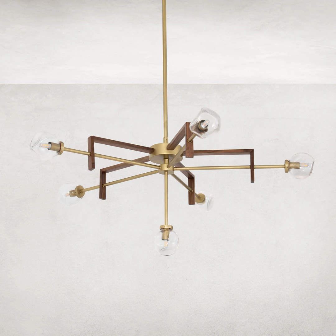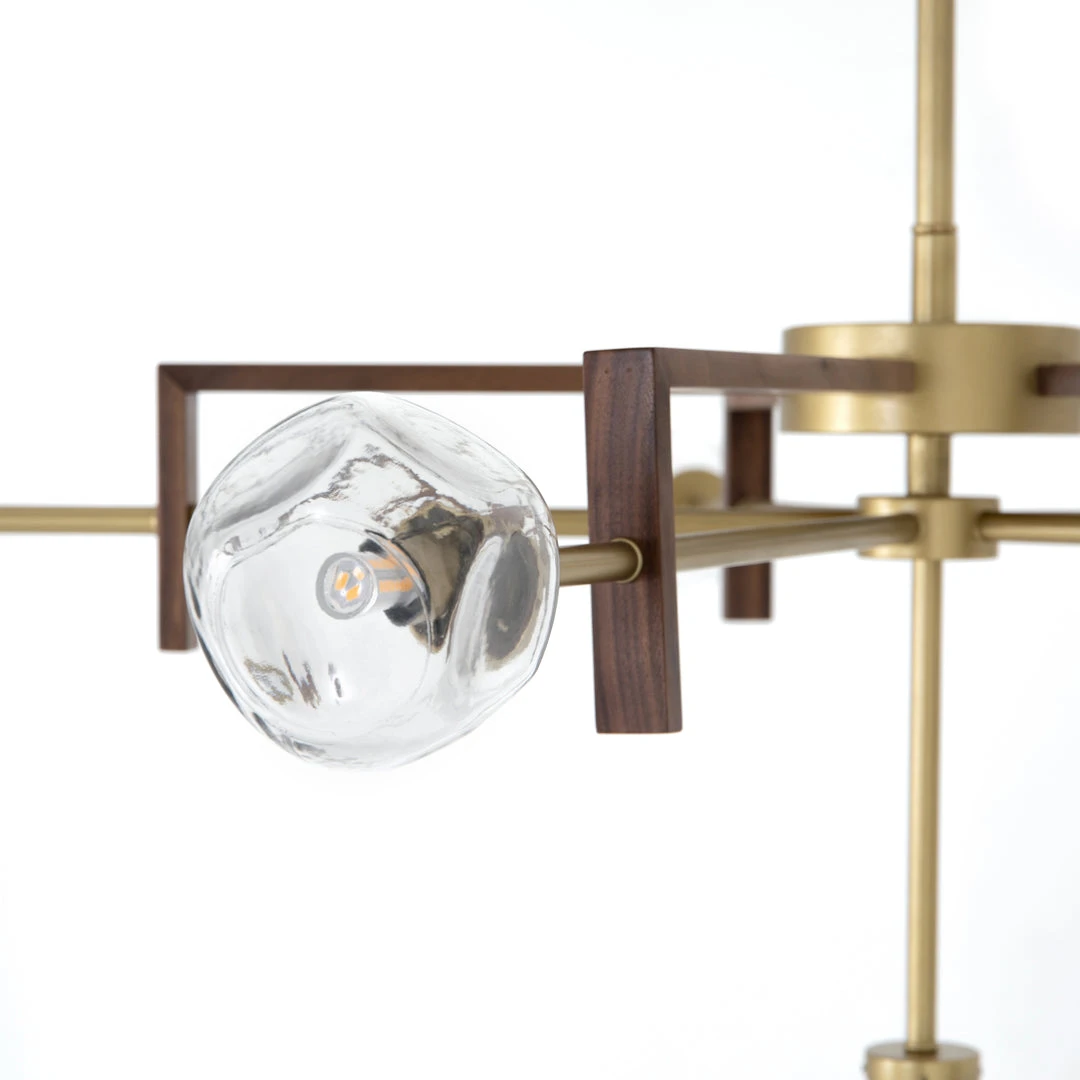Add a modern touch with mixed materials with the Sterling Chandelier in Organic Textured Glass from Four Hands. The strikingly shaped chandelier features long brass-finished steel arms with organically shaped cast glass globes and walnut veneer detailing. Includes dimmable G9 LED bulbs plus additional piping for adjustability from 30″ to a maximum hanging length of 43″.Â