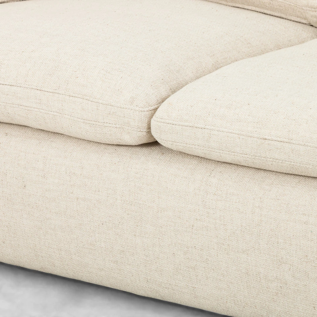 Sink-in luxury with the Plume Sofa in Thames Cream from Four Hands. Designed to mimic the casual comfort of a feather duvet, squared block arms frame feather-and-down-filled seating for a relaxed look and feel. Fluff cushions regularly to maintain appearance; steam fabric for a more tailored look.