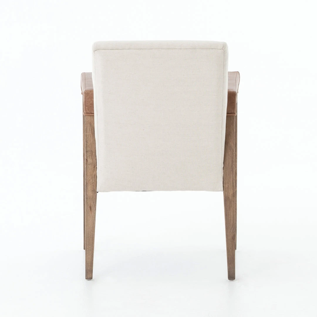 Four Hands presents the Reuben Dining Chair, capturing easy elegance for your dining room. Slim, tapered oak with arms wrapped in vintage leather support a floating seat covered in natural linen. The Reuben is ideal for dining rooms, breakfast nooks and kitchens.Â