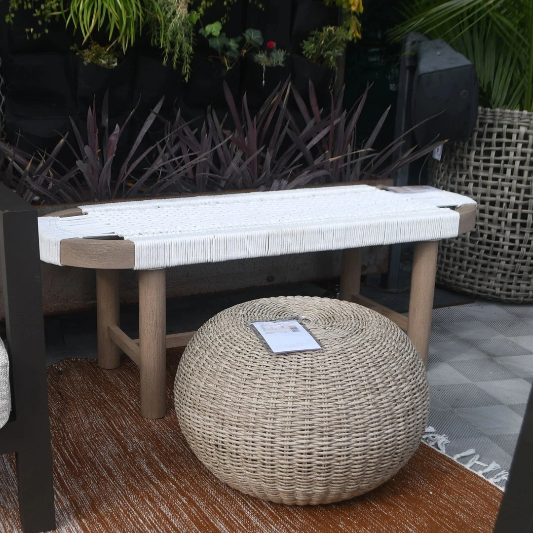 Clean and angular for streamlined effect, the Sumner Outdoor Bench in Washed Brown by Four Hands is perfect for your outdoor space. Teak framing is finished in a washed brown, with white rope seating, woven for textural effect. *Cover or store inside during inclement weather and when not in use.
