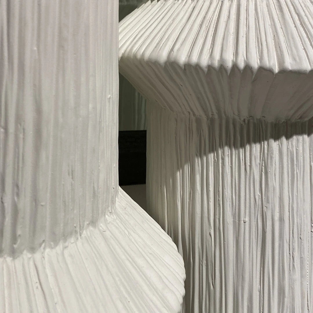 The Ascending Ring Vases from Global Views are impressive in size, each with a pointed collar that coordinates with its respective shape. Heavily textured and finished in a matte white glaze, these make the perfect hostess or housewarming gift. Display in the foyer, living room or bedroom.